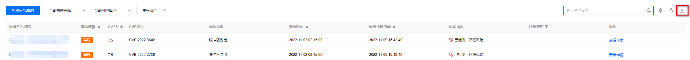 如需查看全部漏洞,依次单击系统漏洞和应用漏洞,导出所有漏洞列表,在列表中查看影响仓库镜像的漏洞即可。一般情况下,镜像扫描的漏洞数据较多,全部修复工作量较大,建议区分优先级依次修复,例如:按应急漏洞,按具有 EXP、POC、远程利用、在野利用等标签等。