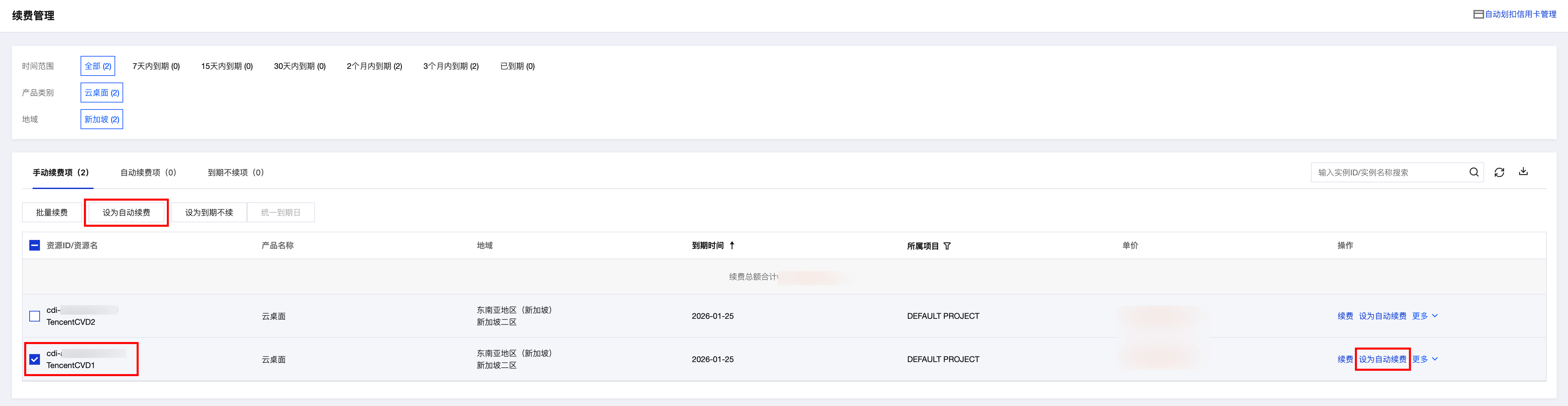 2. 找到您想要订阅自动续费的云桌面实例,单击设为自动续费。如下图: