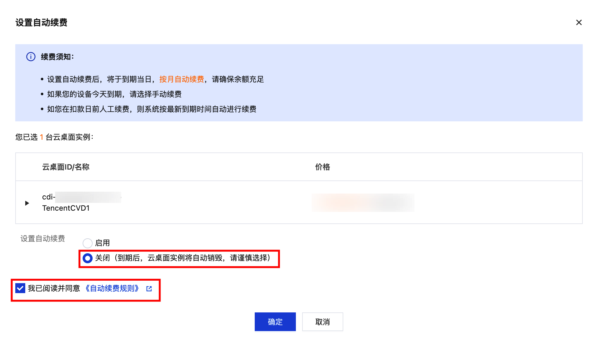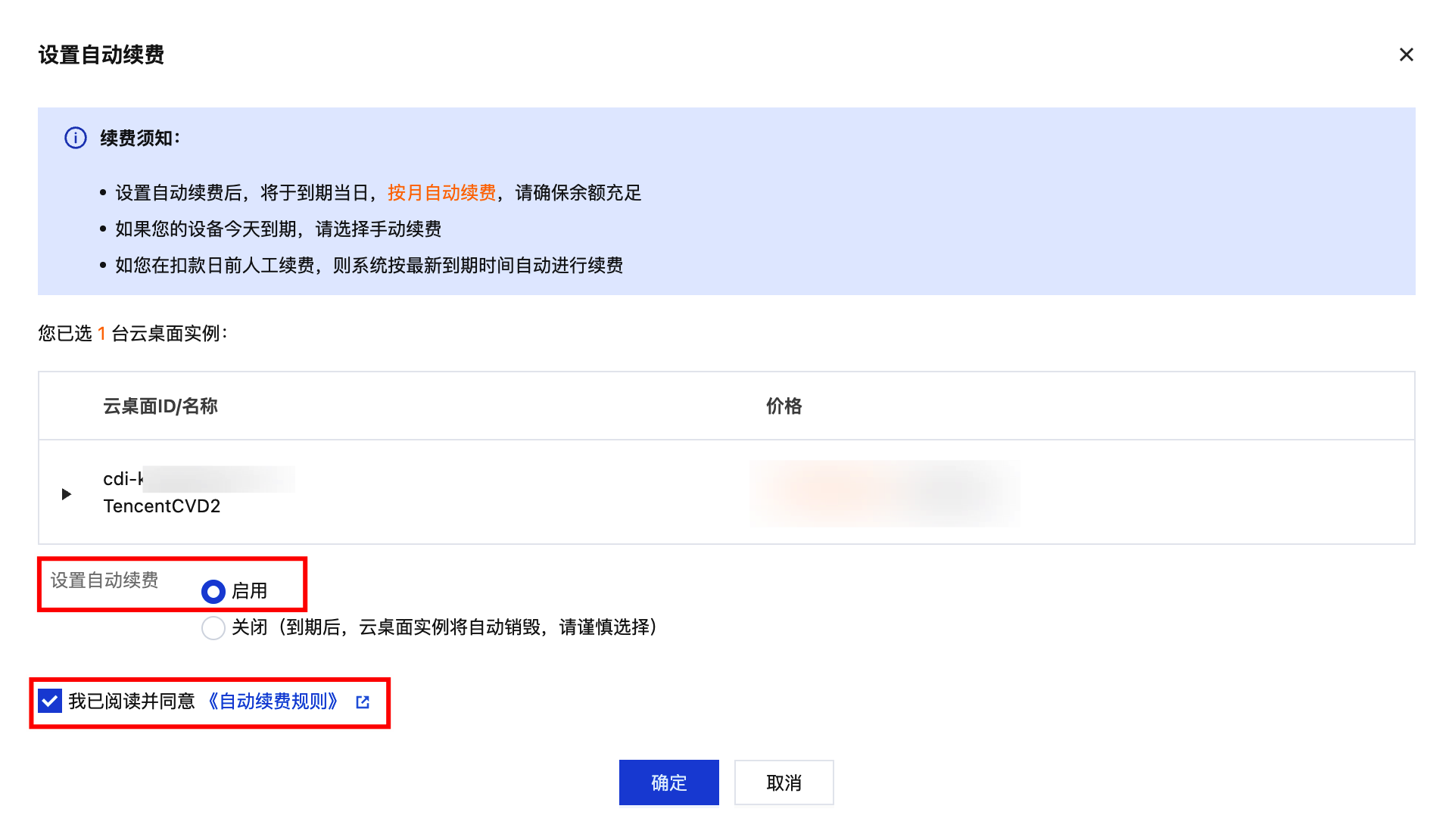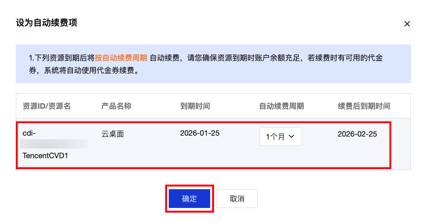 3. 在弹出的自动续费窗口,确认云桌面实例信息,确认无误后勾选同意 自动续费,选择启用自动续费设置。