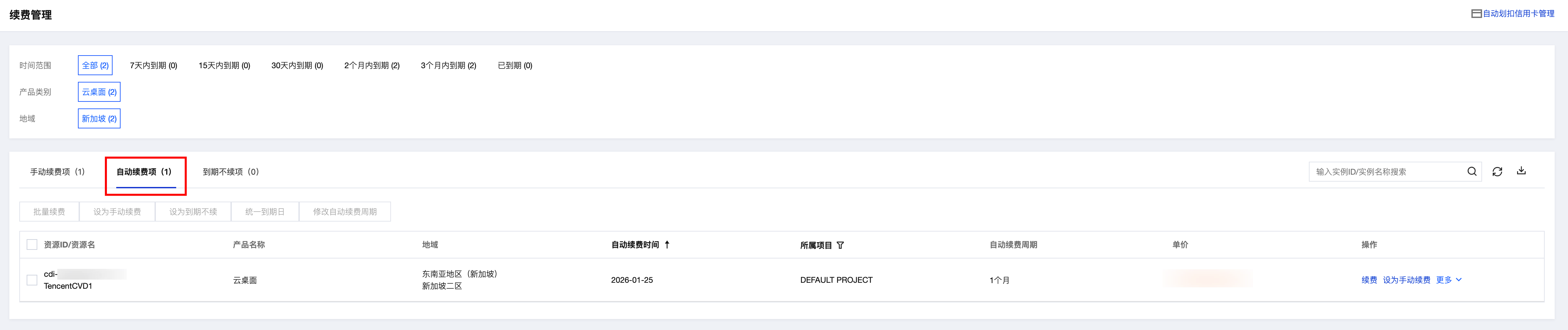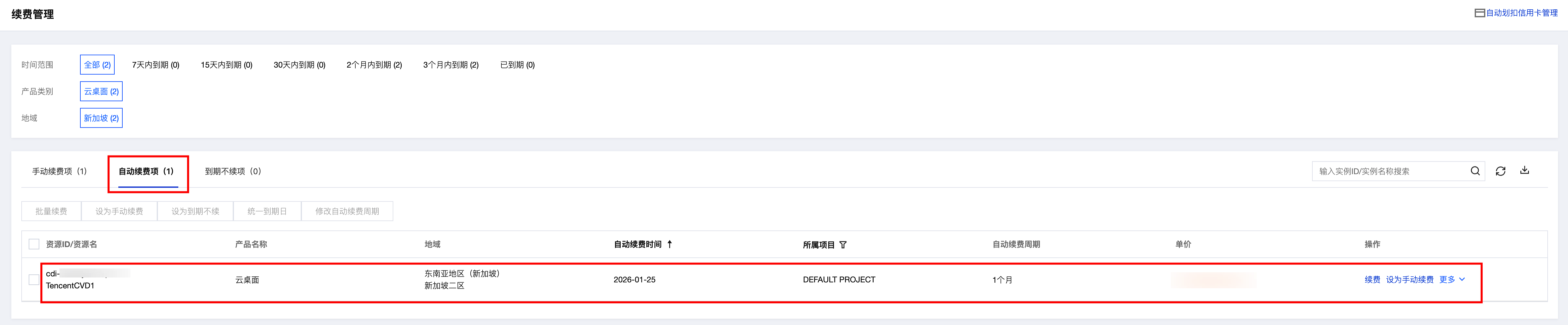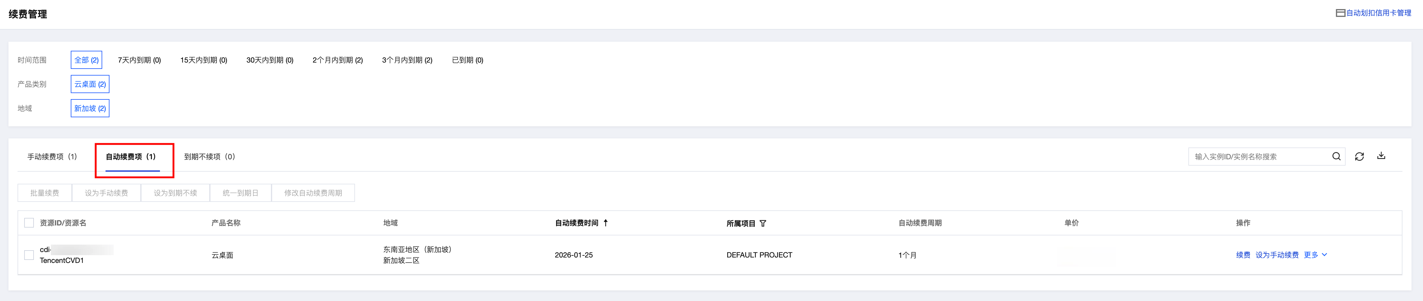 2. 找到您想要查阅的自动续费的产品,在自动续费页查看自动续费相关信息。