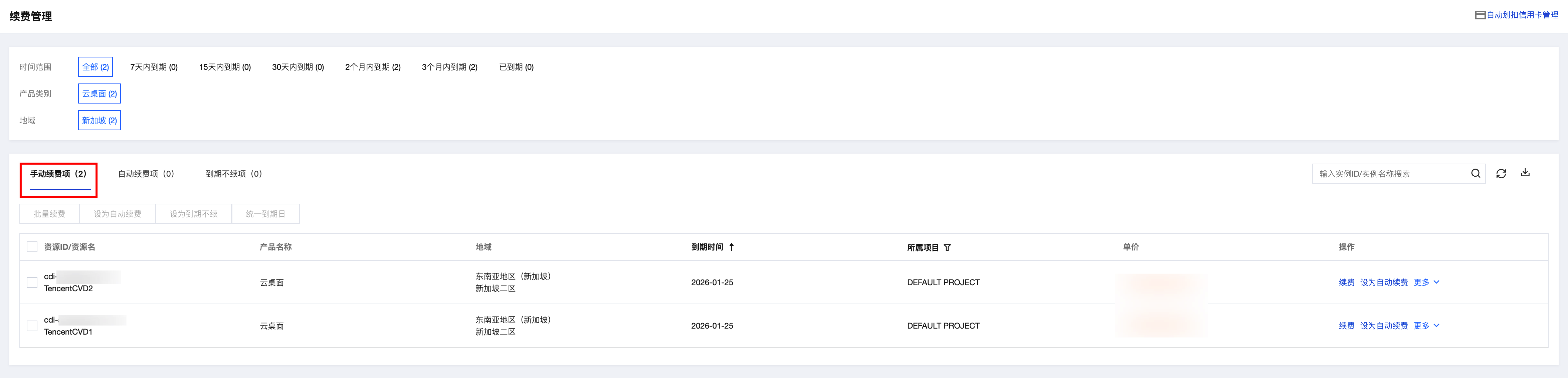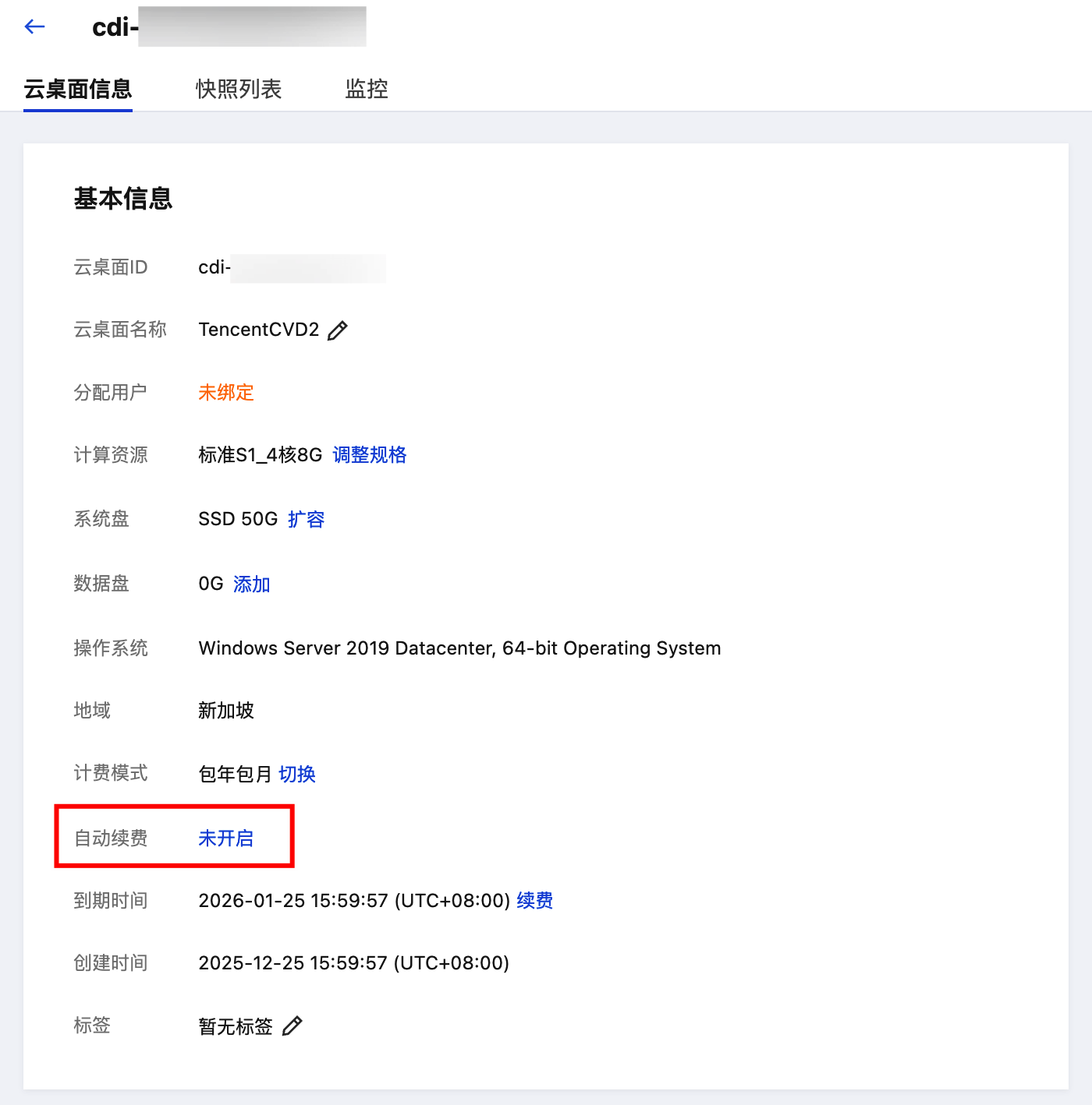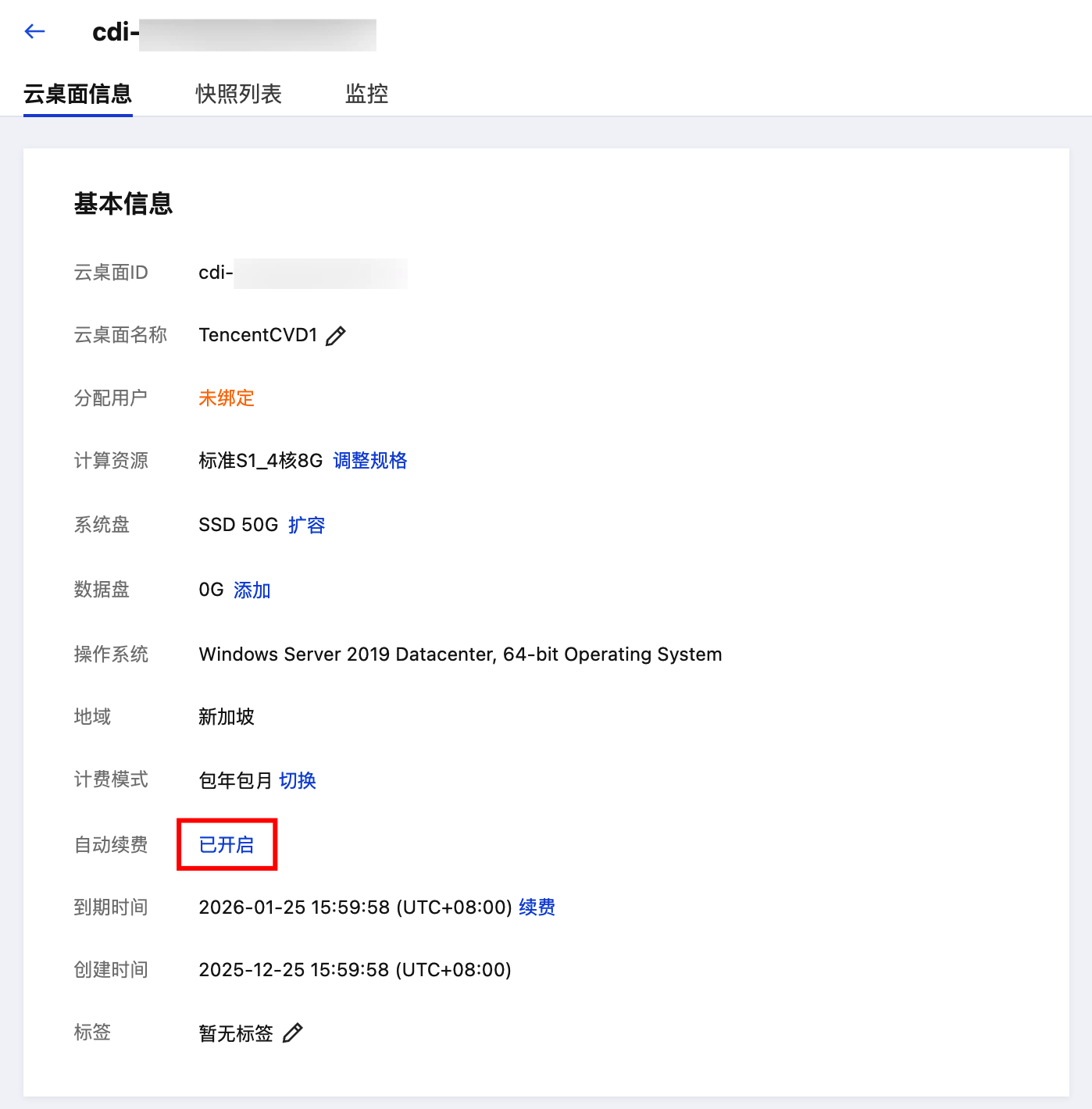 2. 找到您想要查阅的自动续费的云桌面实例,在产品详情页查看自动续费相关信息。