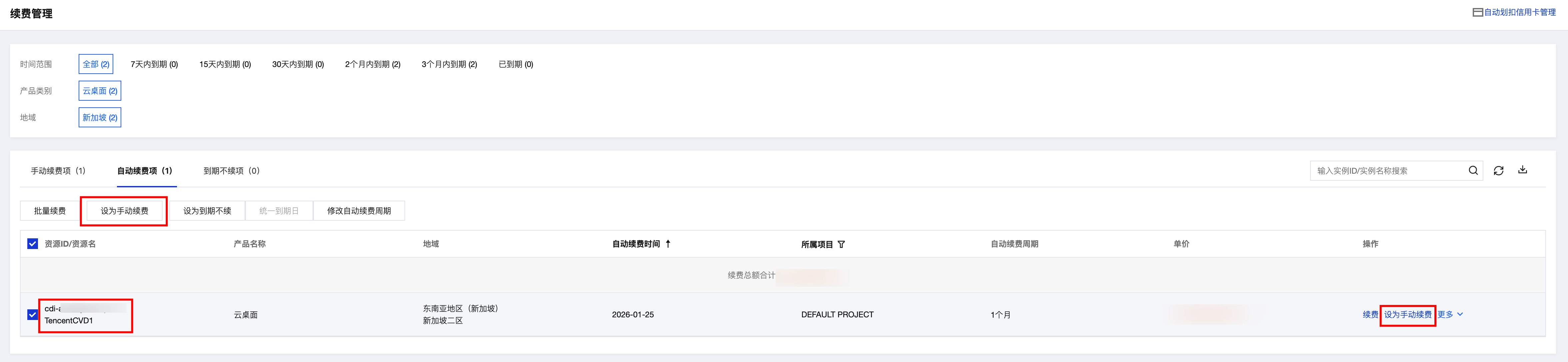 2. 找到您想要取消已订阅自动续费的云桌面实例,单击设为手动续费来取消自动续费。