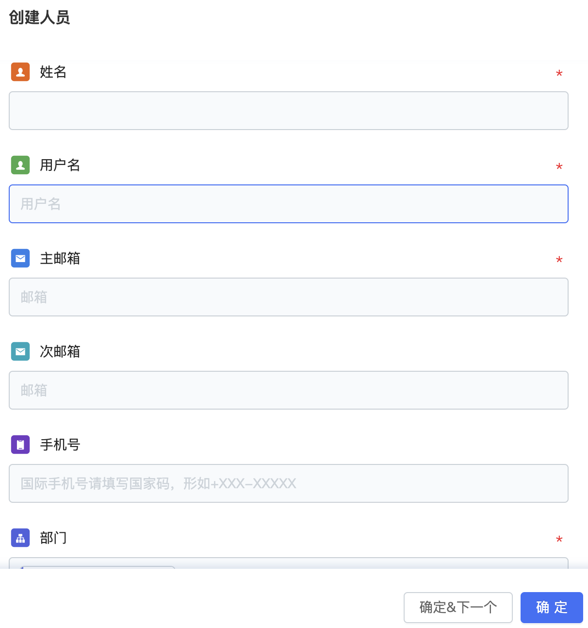 2. 然后单击创建人员并填写相关信息,创建需要被分配使用云桌面的终端用户。更详细的用户操作请访问 用户管理。 说明: