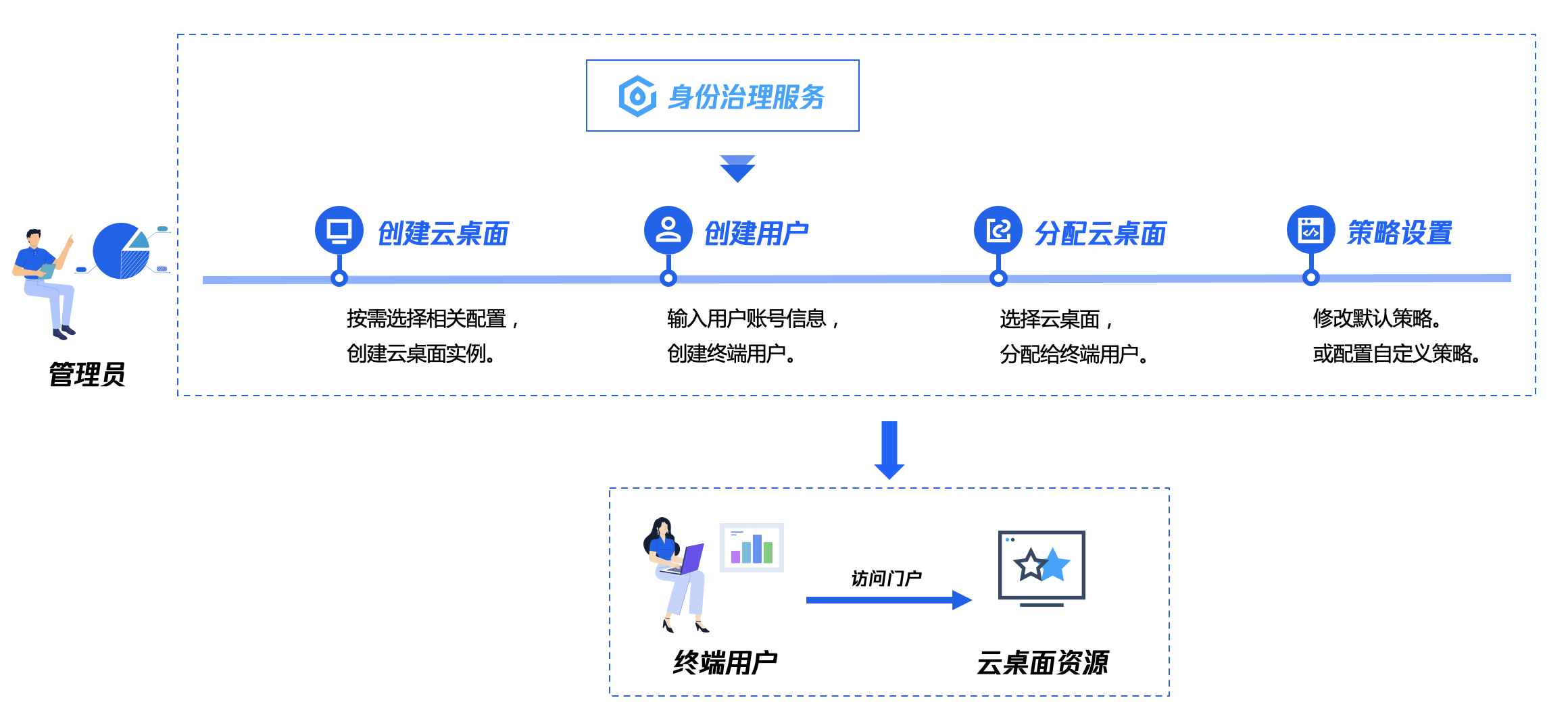 1. 请您根据业务需求进行合理规划,在控制台中创建云桌面实例,具体操作请参见 购买云桌面。 2. 您需要根据用户规划情况,在腾讯云 IDaaS 中创建用户或者批量导入用户,具体操作请参见 用户管理。 3. 您需要将已经创建好的云桌面资源分配给终端用户,具体操作请参见 绑定用户。 4. 您可以按业务需求进行云桌面策略规划,在策略管理中设置默认策略或者创建自定义策略,具体操作请参见 策略管理。