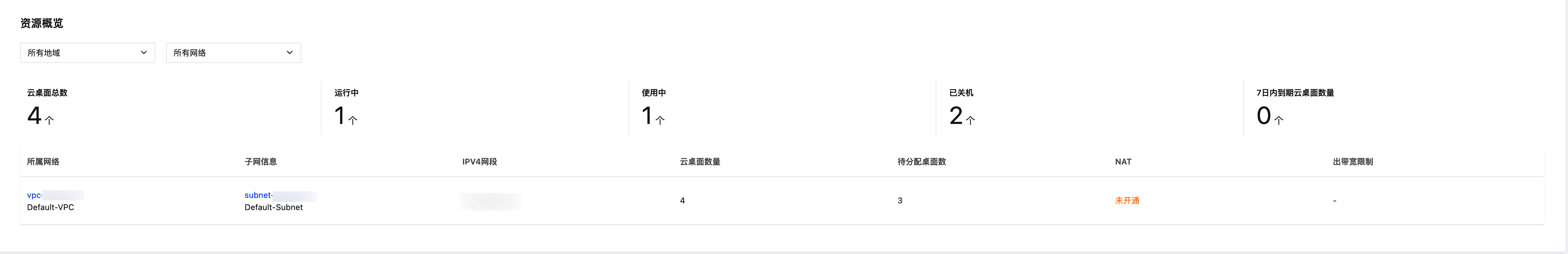 云桌面概览为您显示云桌面基本使用情况,您可以在这个模块中查看不同网络中的云桌面使用情况。