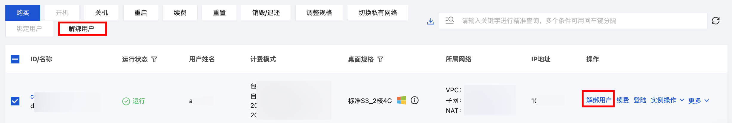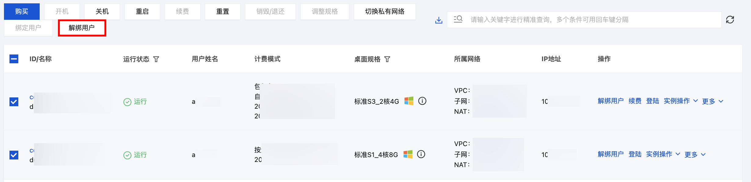 2. 在桌面列表中,选择您需要操作的云桌面,在上方操作栏或右侧操作列中单击解绑用户。