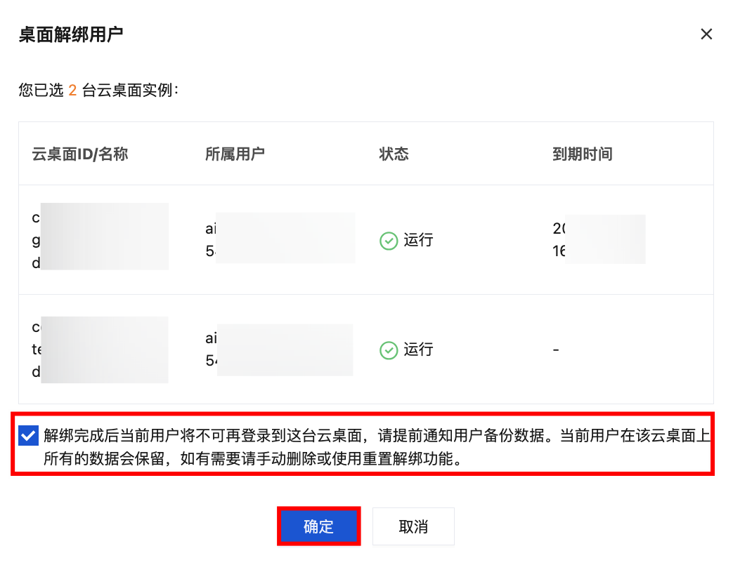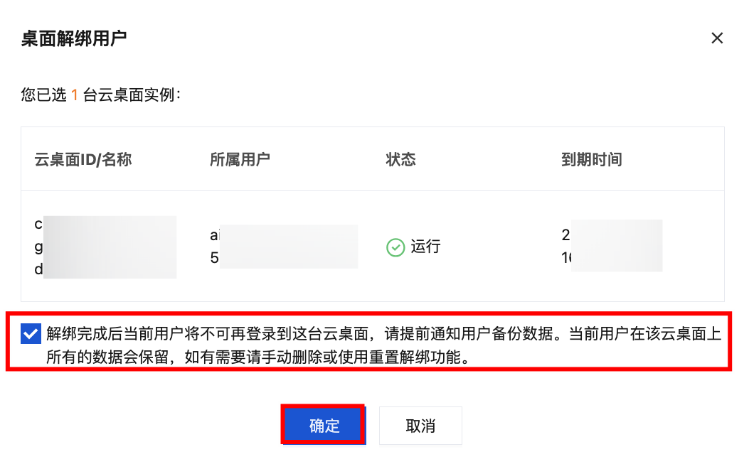 如当前云桌面运行状态为使用中,解绑用户操作后当前用户正在连接的云桌面会话将被注销,请提前通知用户备份数据。