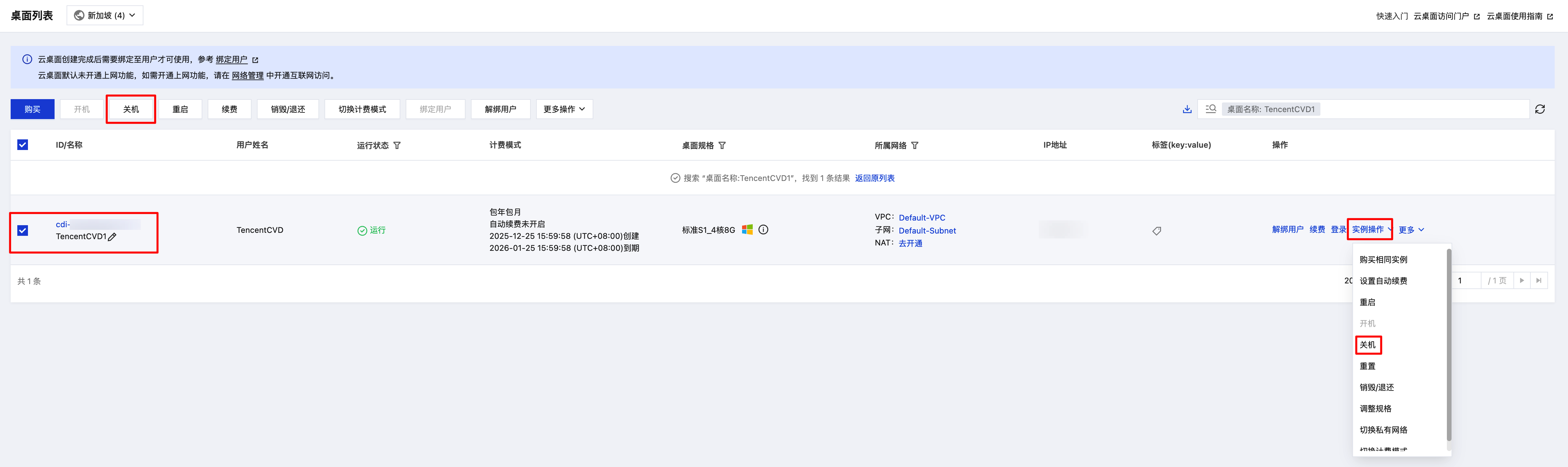 2. 在桌面列表选择运行状态为“运行”的实例,在顶部操作栏单击关机或在右侧操作列中单击实例操作 > 关机。
