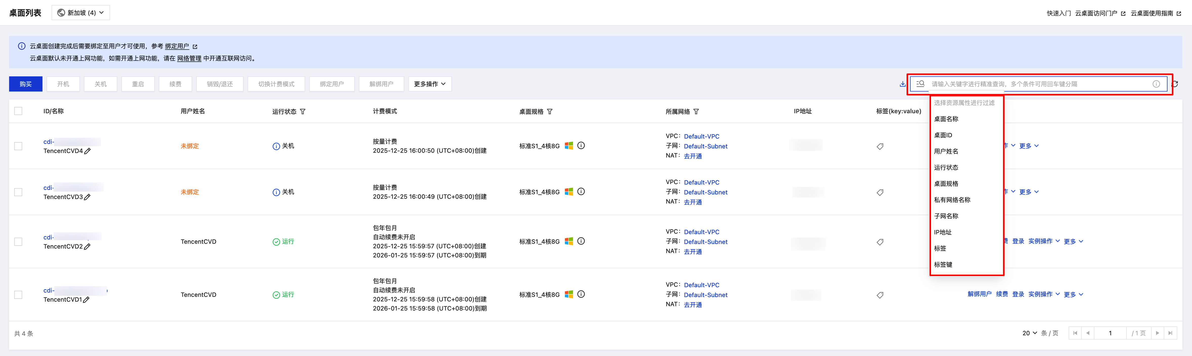 2. 在桌面列表的搜索框中按需选择资源属性,输入需要搜索的内容,单击确定或回车键进行搜索。可以重复操作进行多属性查询。