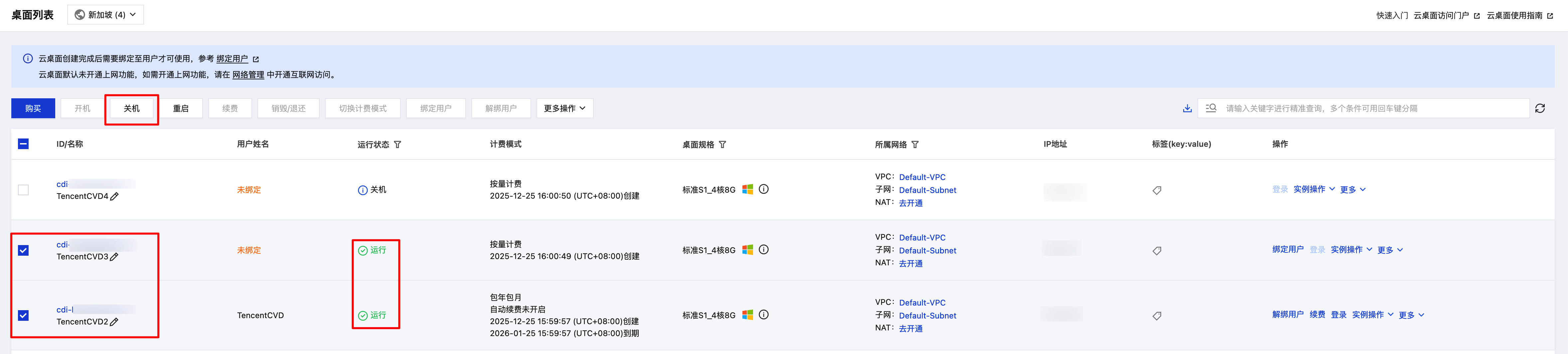 2. 在桌面列表选择多个运行状态为“运行”的实例,在顶部单击关机,即可批量操作云桌面实例。
