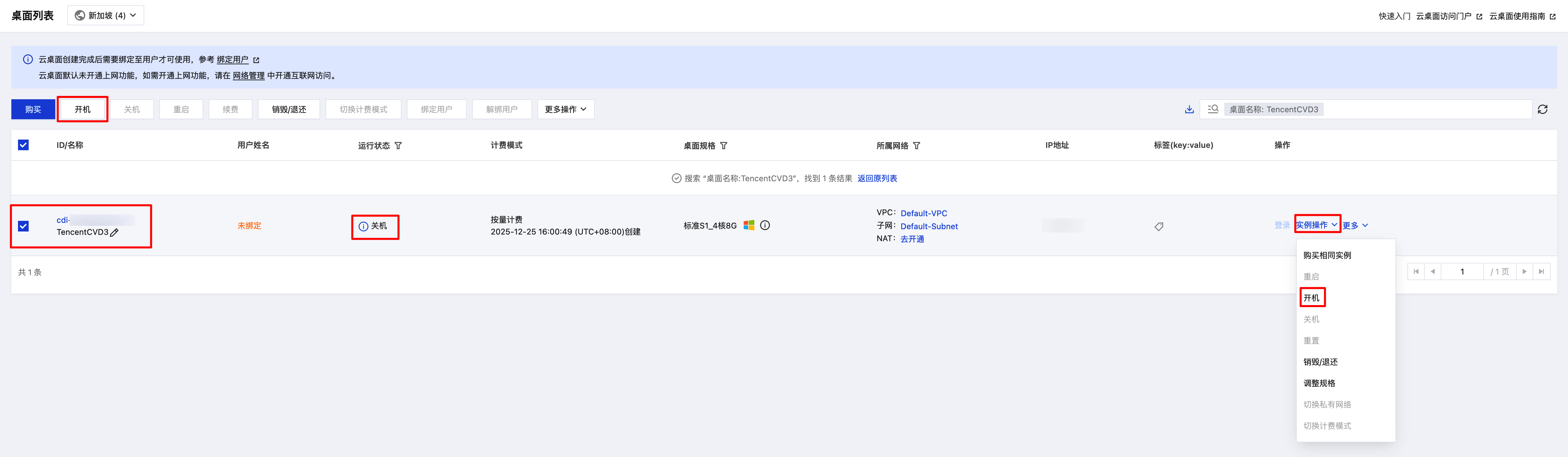 2. 在桌面列表选择运行状态为“关机”的实例,在顶部操作栏单击开机或在右侧操作列中单击实例操作 > 开机。