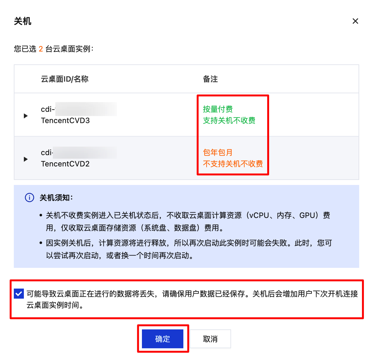 3. 按量付费云桌面支持开关机按量付费,选择关机时会进行相关提示。