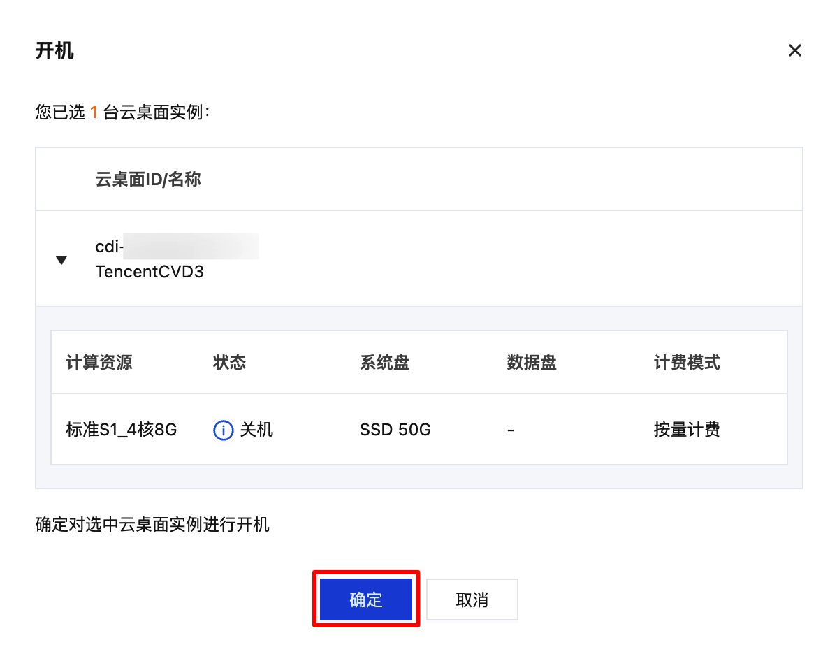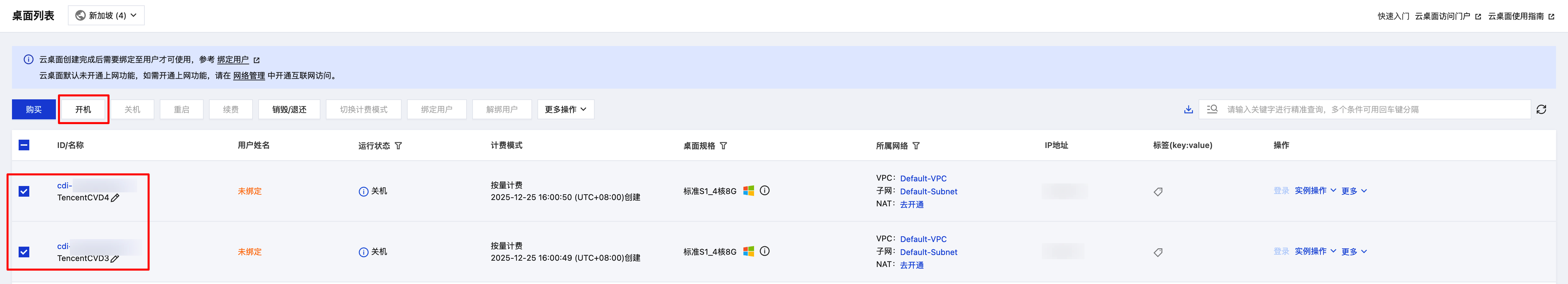 2. 在桌面列表选择多个运行状态为“关机”的实例,在顶部单击开机,即可批量操作云桌面实例。
