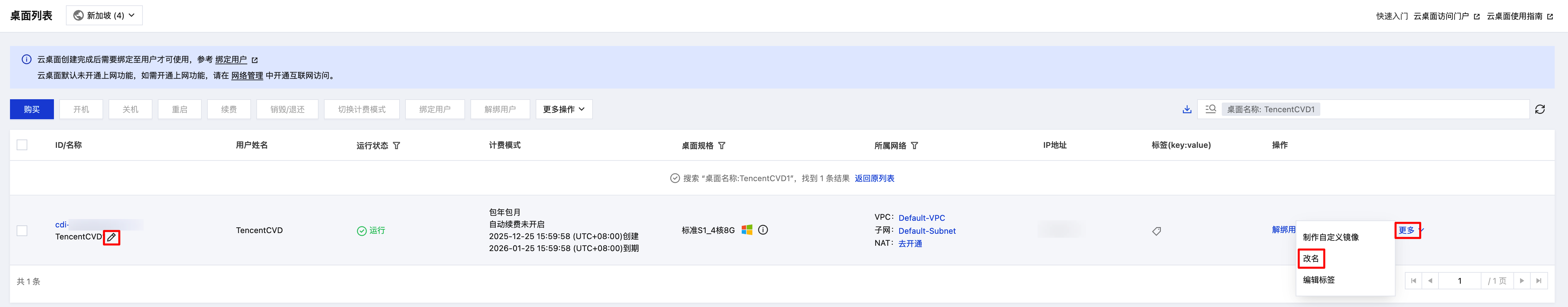 中,选择需要被修改实例名称的云桌面,单击操作列中的