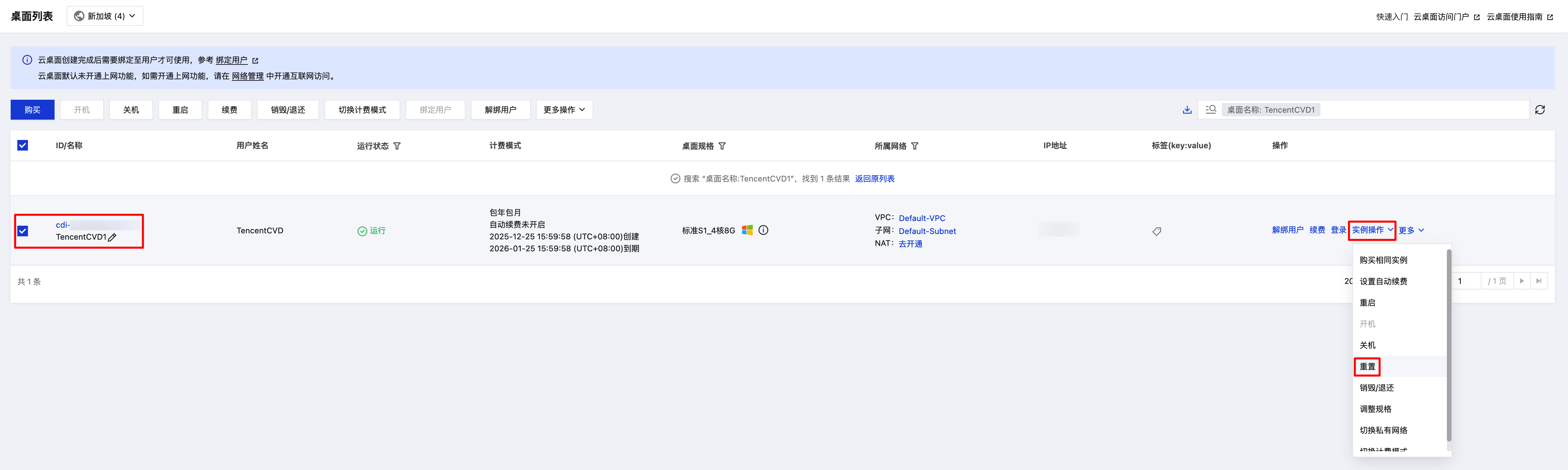 操作单个云桌面实例重置