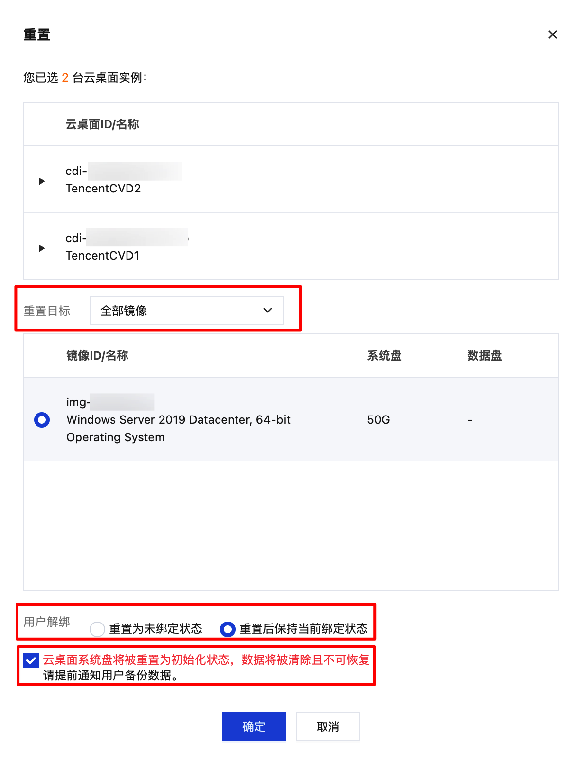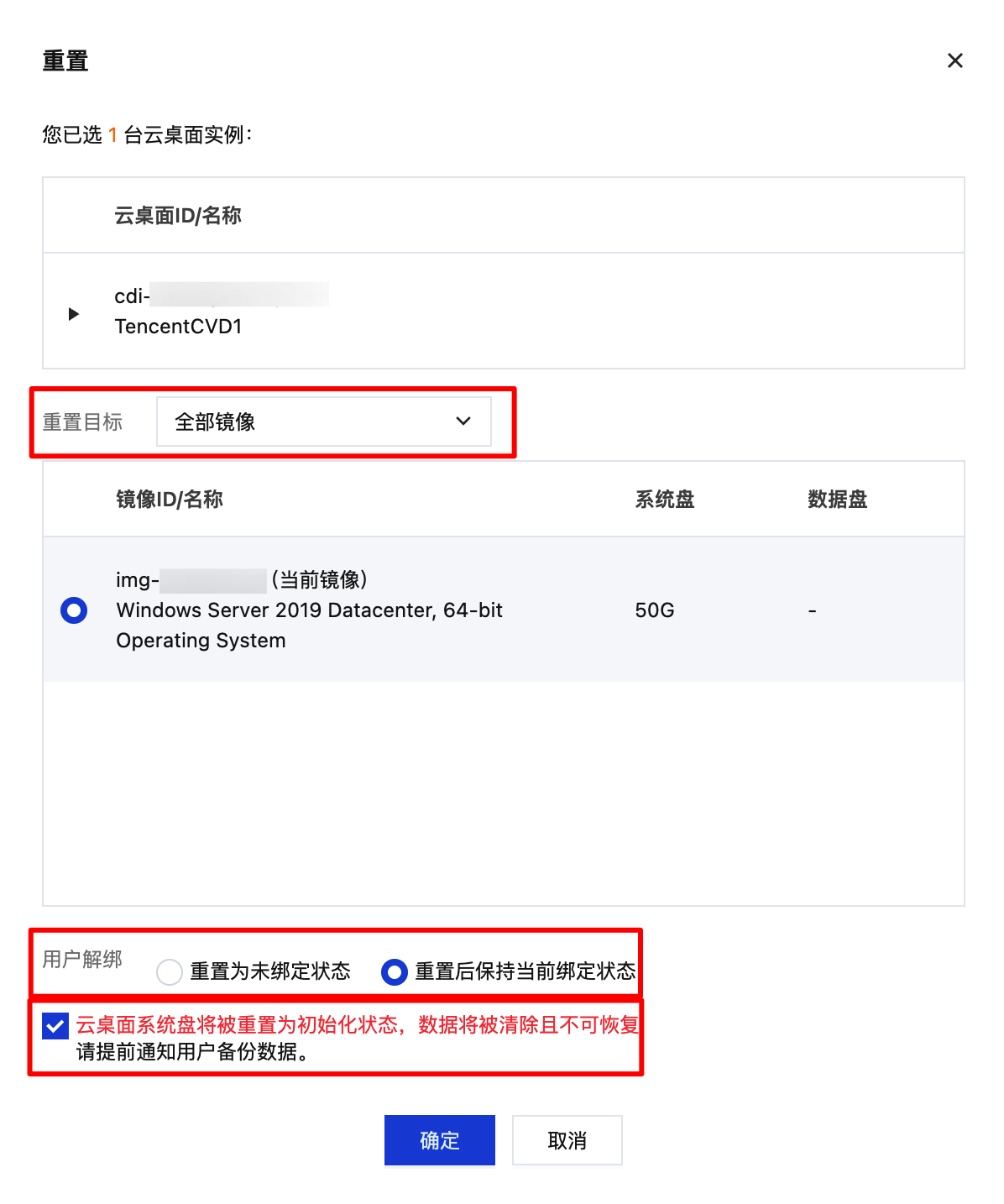 重置后云桌面系统盘将被重置为初始化状态,数据将被清除且不可恢复,请提前通知用户备份数据。