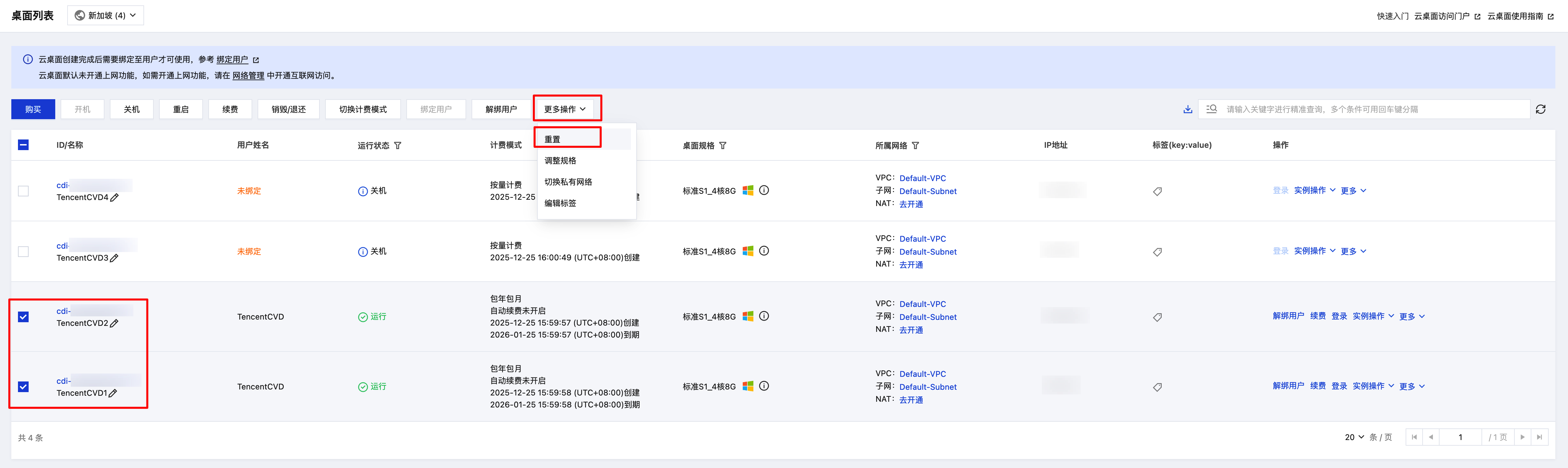 2. 勾选需要重置的实例,在列表顶部,单击重置,即可批量操作云桌面实例重置。