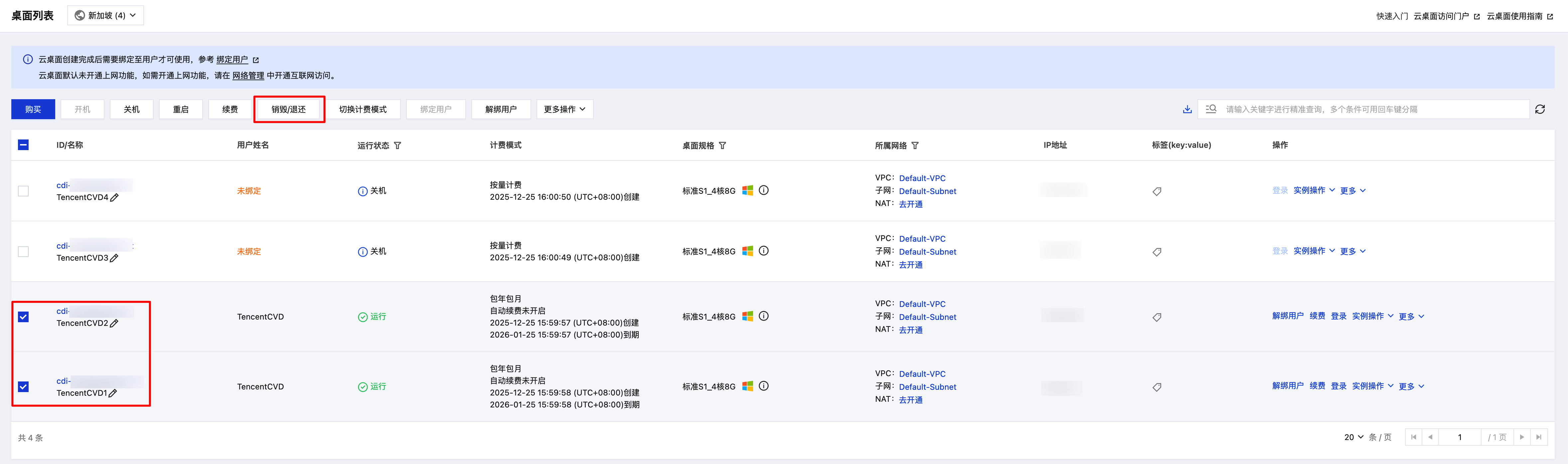 2. 勾选需要操作的桌面,在列表顶部,单击销毁/退还,即可批量操作云桌面。