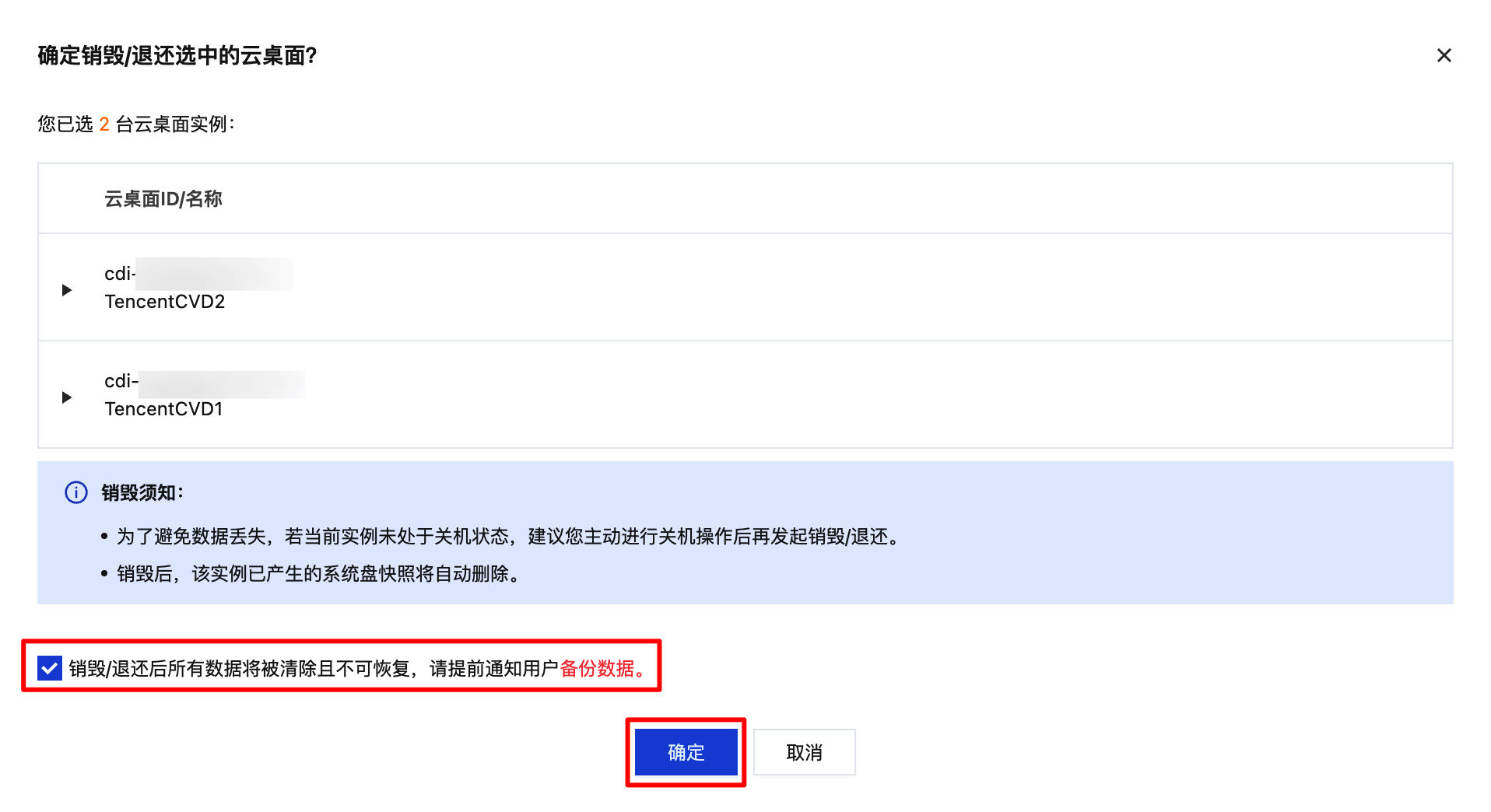 3. 在弹窗内再次确认实例后,单击确定即可销毁/退还。