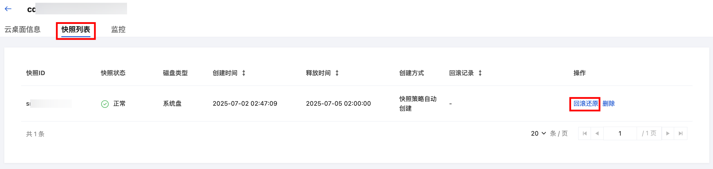 3. 在云桌面详情页中,单击进入快照列表页面。选择需要回滚的快照项,并在右侧操作列中单击回滚还原。