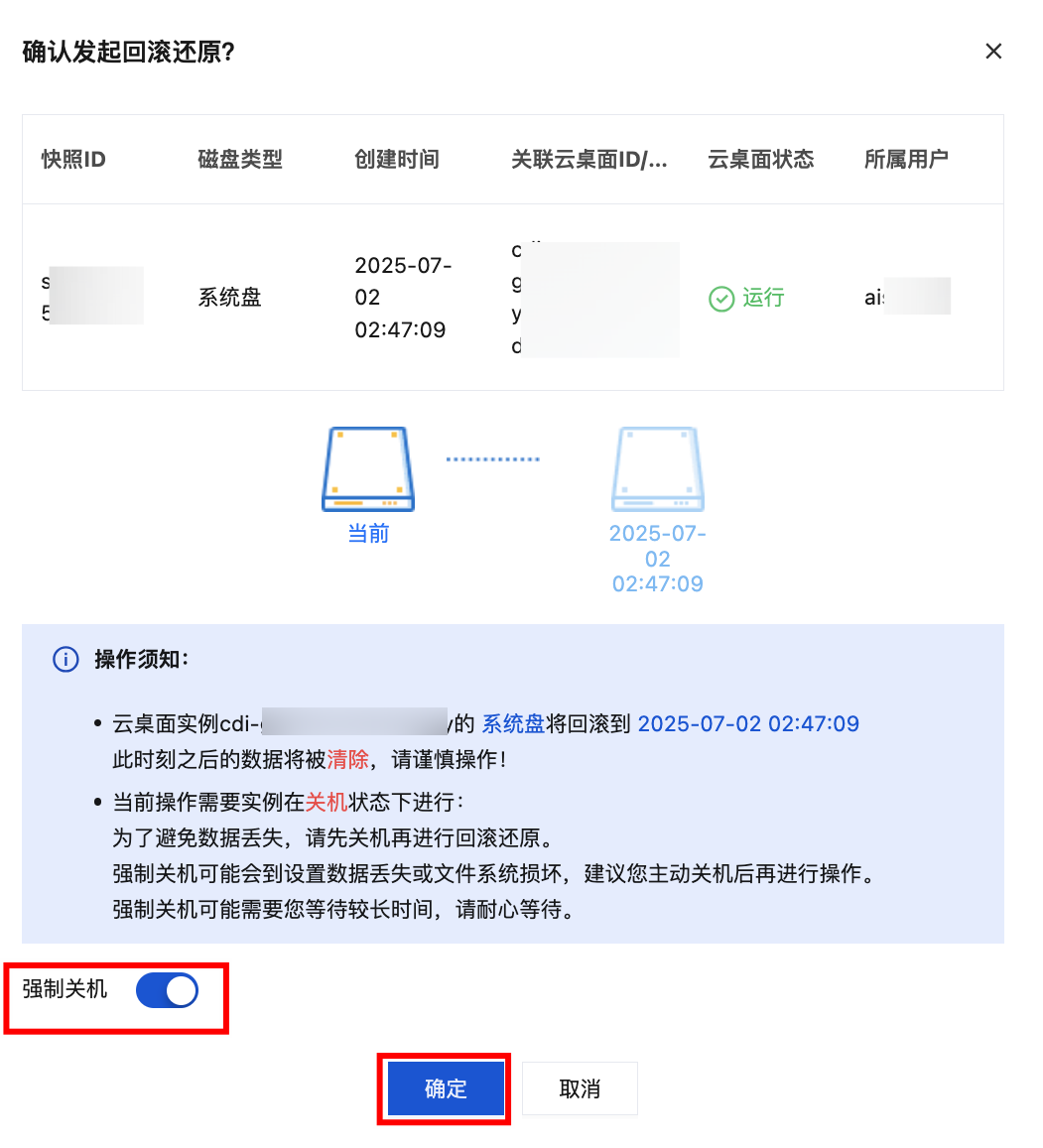 4. 进行回滚二次确认,回滚会清除当前云桌面数据,阅读风险提示后勾选强制关机开关,单击下方的确定。