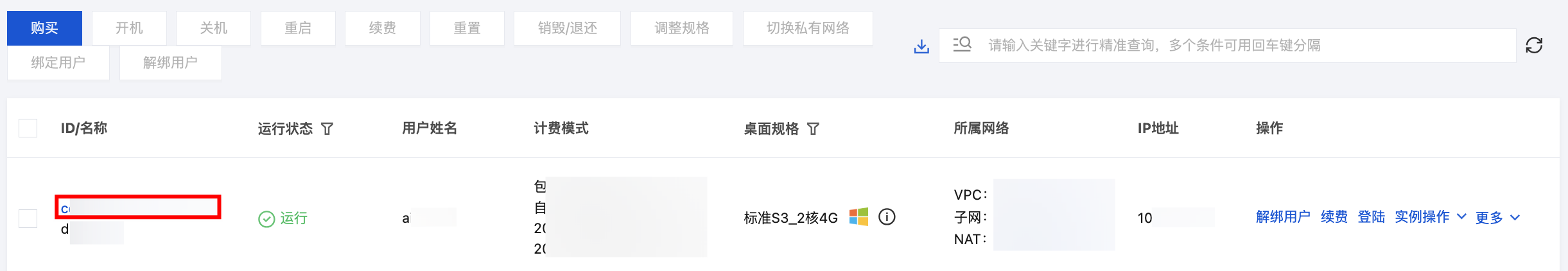 2. 在桌面列表中,选择需要回滚的云桌面,单击左侧的云桌面 ID 进入云桌面详情页。