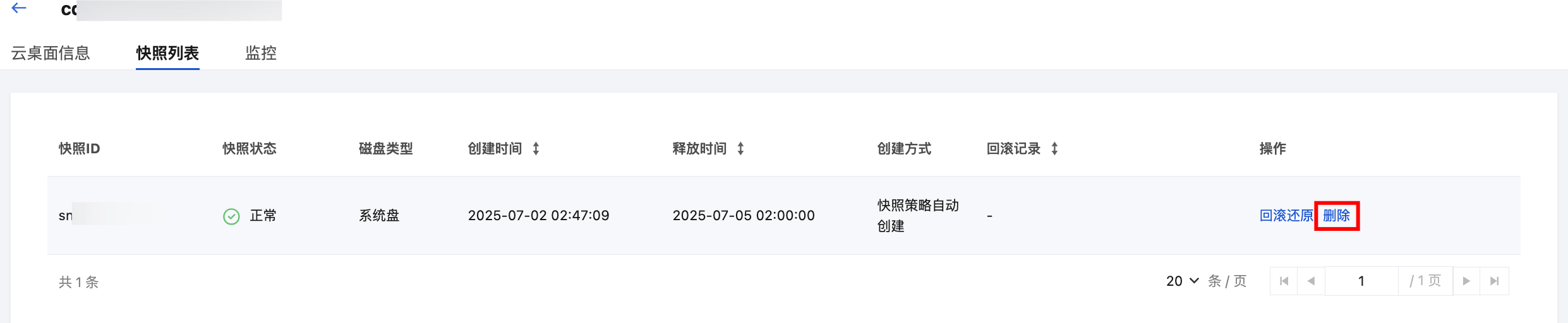 3. 在云桌面详情页中,单击进入快照列表页面。选择需要删除的快照项,并在右侧操作列中单击删除。