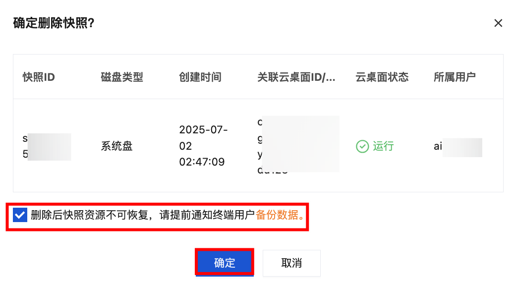 4. 删除的快照无法恢复,如果确认需要删除,请先勾选“删除快照后资源不可恢复,请提前通知终端用户备份数据”的提示框,再单击下方的确定。