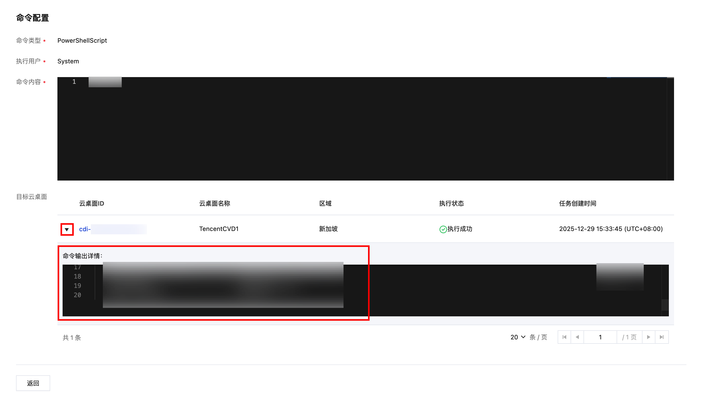 8. 单台云桌面实例展开后可查看命令输出详情,执行失败的云桌面实例,展开时显示失败信息。