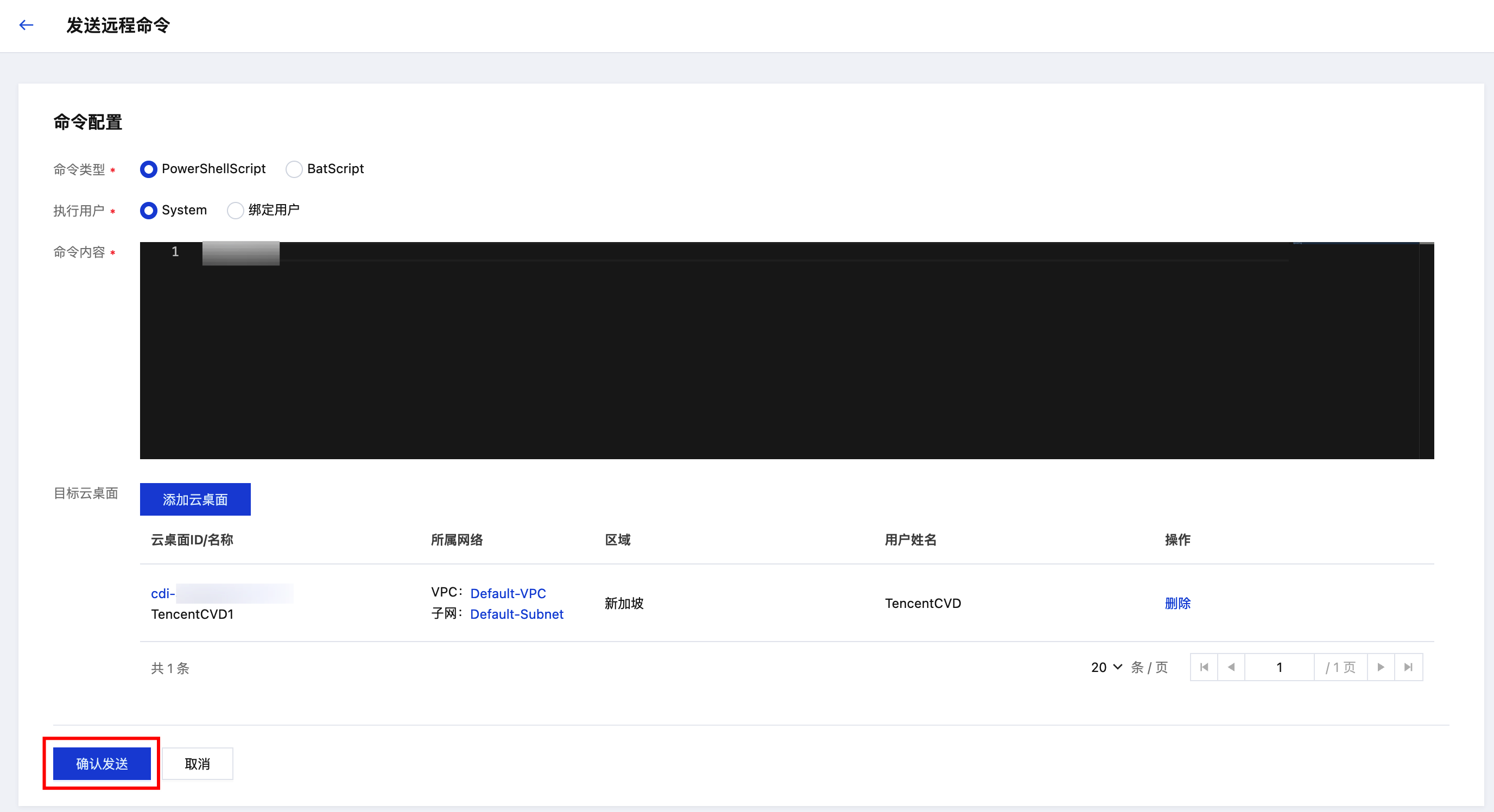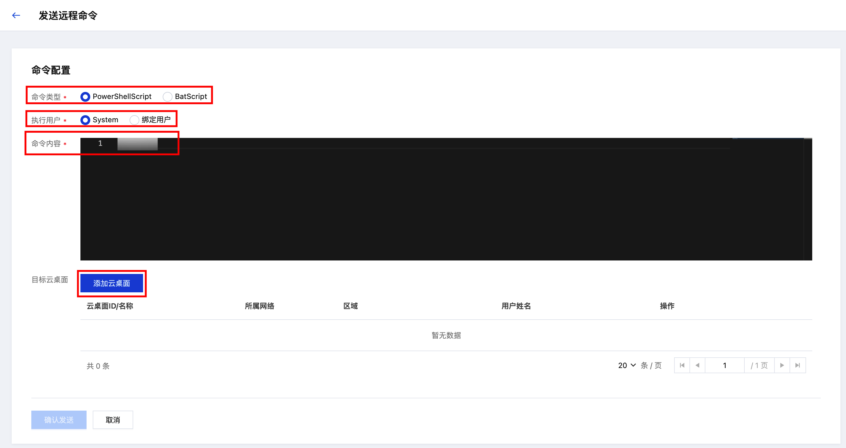 3. 进入命令配置页面,选择命令类型和执行用户,并输入命令内容。然后,单击添加云桌面,选择需要配置的云桌面。