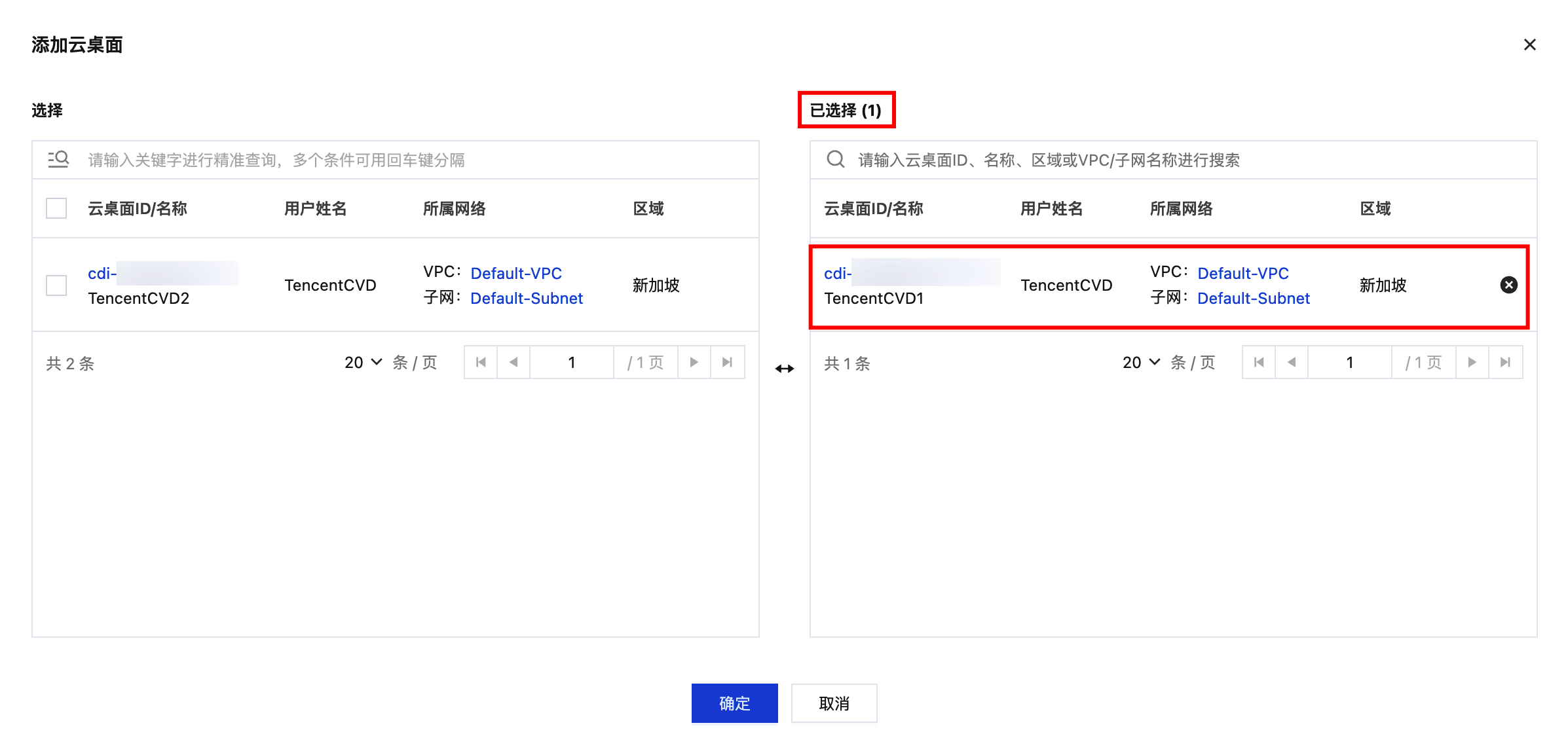 4. 可以通过搜索或者手动添加一个或多个云桌面,并单击确定。