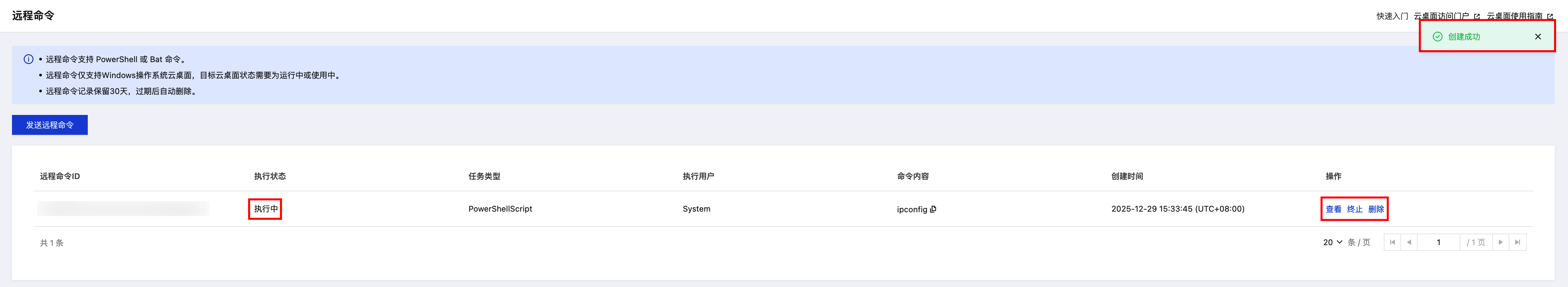 6. 成功后会弹出“创建成功”提示。此时,执行状态会显示“执行中”。单击操作列中的查看可以查看执行进程,选择终止或删除执行中的进程时,会进行弹窗二次确认。