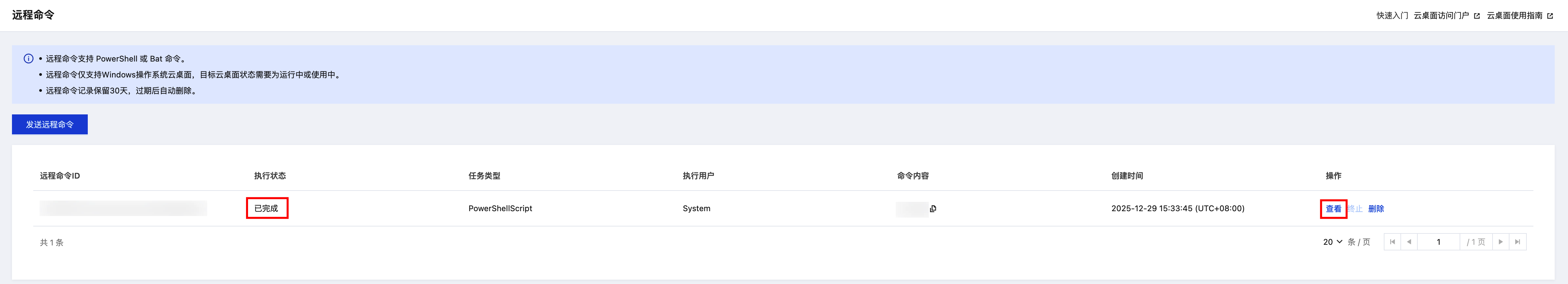若需删除远程命令记录,可以单击操作列中的删除,删除后无法恢复,请谨慎操作。