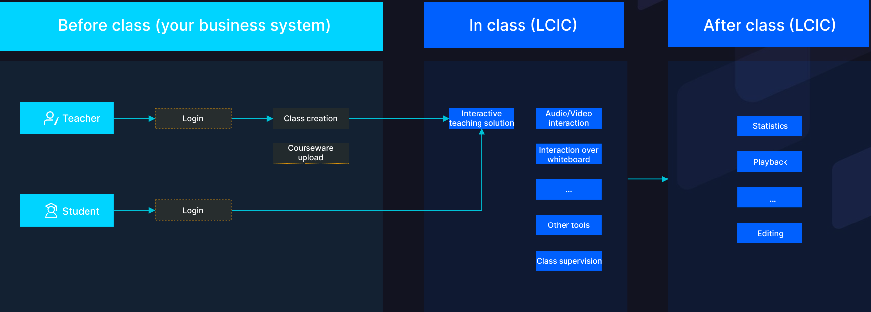 实现功能 | 提供课堂内的实时互动功能,支持实时音视频、实时消息、互动白板、实时录制、屏幕共享等核心功能。提供接口 API 用于课堂和用户管理。支持业务功能的灵活扩展,能够与教学机构的用户系统和排课系统无缝对接。 | 客户自行实现实时音视频、实时消息、互动白板等功能。 |