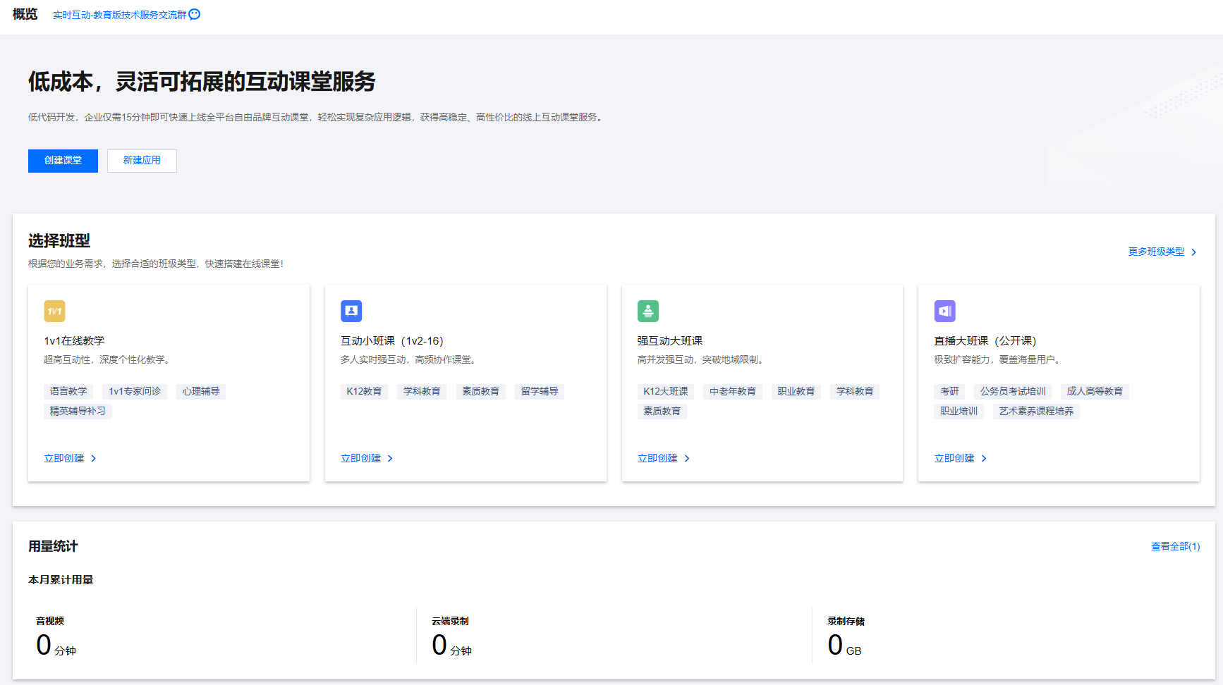 实时互动-教育版控制台为您提供用量统计、创建课堂等功能。