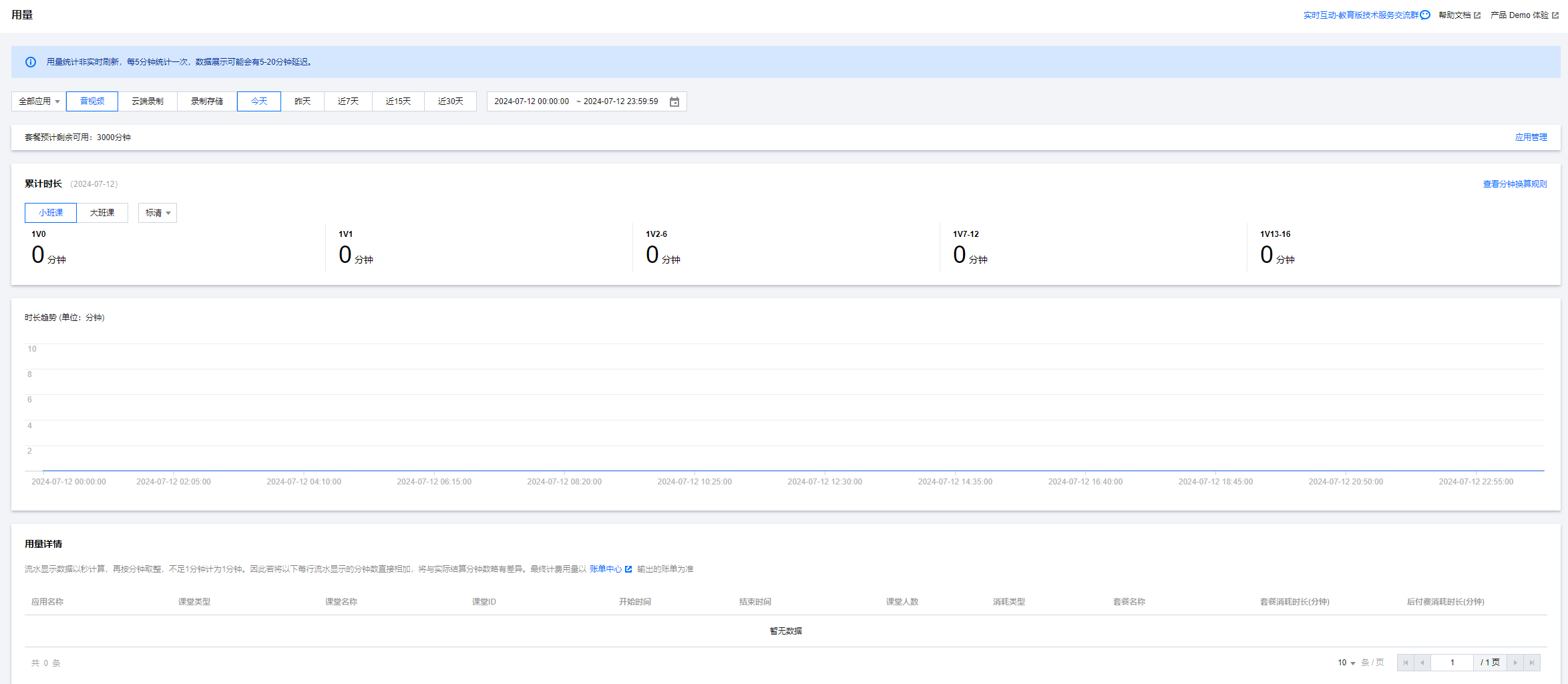 订阅包消耗时长 | 消耗用量对应的课堂,所消耗的实际总时长,消耗来源于订阅包用量,比如10名学生,一堂课60分钟,则消耗时长为600分钟; |