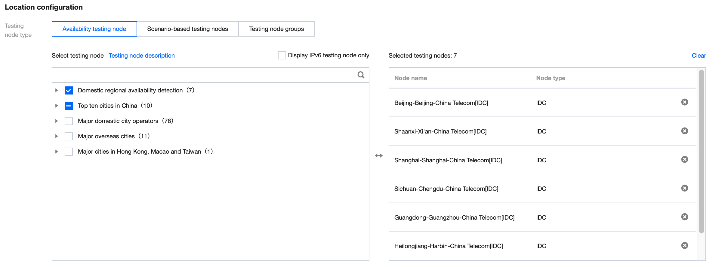自定义拨测点组:选择拨测点地域 > 选择拨测点类型 > 在右侧框中勾选拨测点。拨测点类型说明如下: