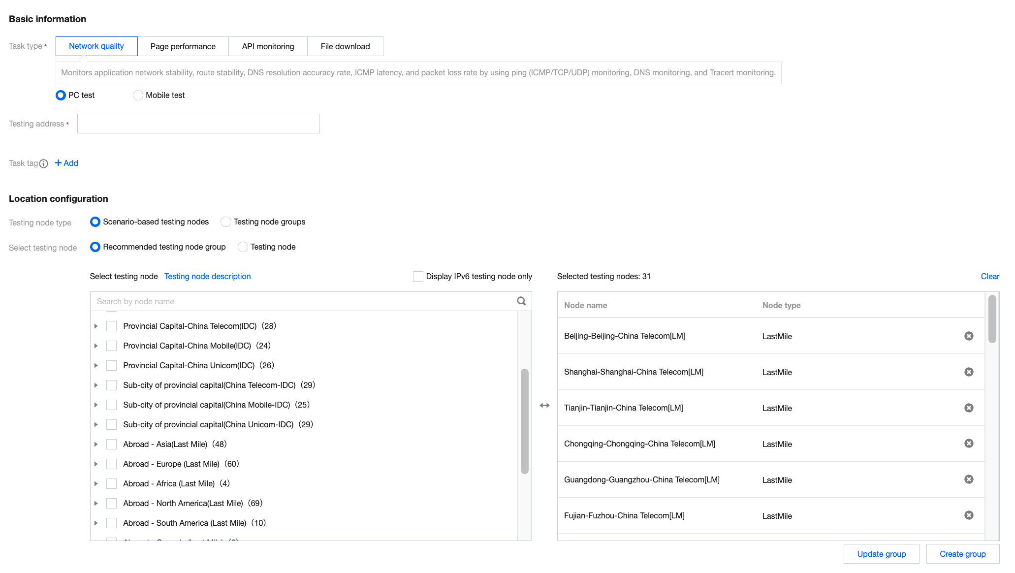 选择拨测任务类型:即时拨测仅支持网络质量、页面性能、文件下载三个任务类型。