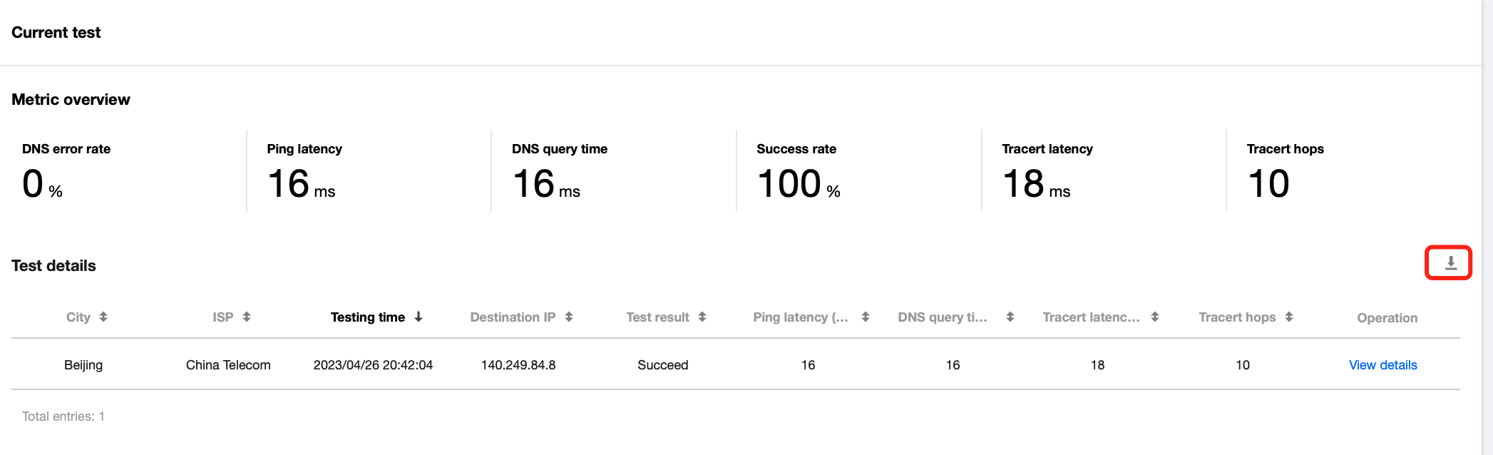 云拨测仅支持保留30天的即时拨测数据,您可以点击探测详情上方的下载按钮,下载即时拨测数据,以满足更长时间的数据储存需求。