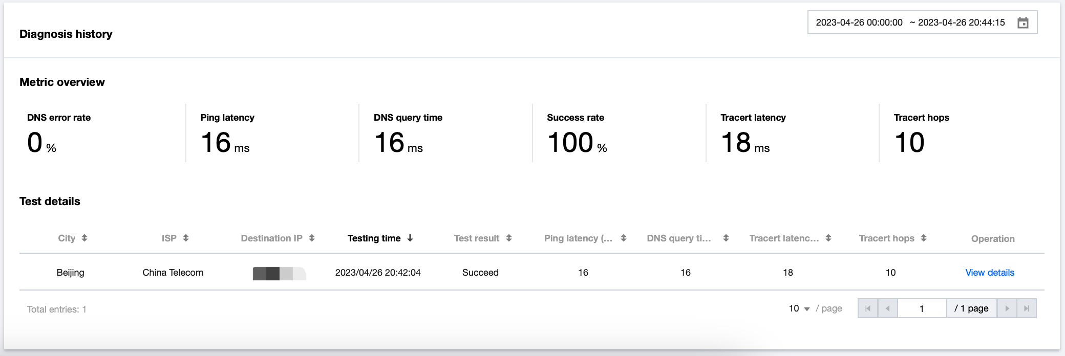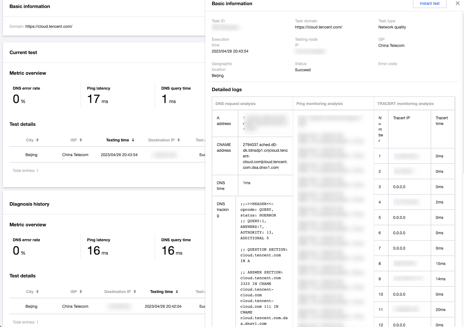 诊断历史会记录同一域名,同一任务类型的拨测历史数据。