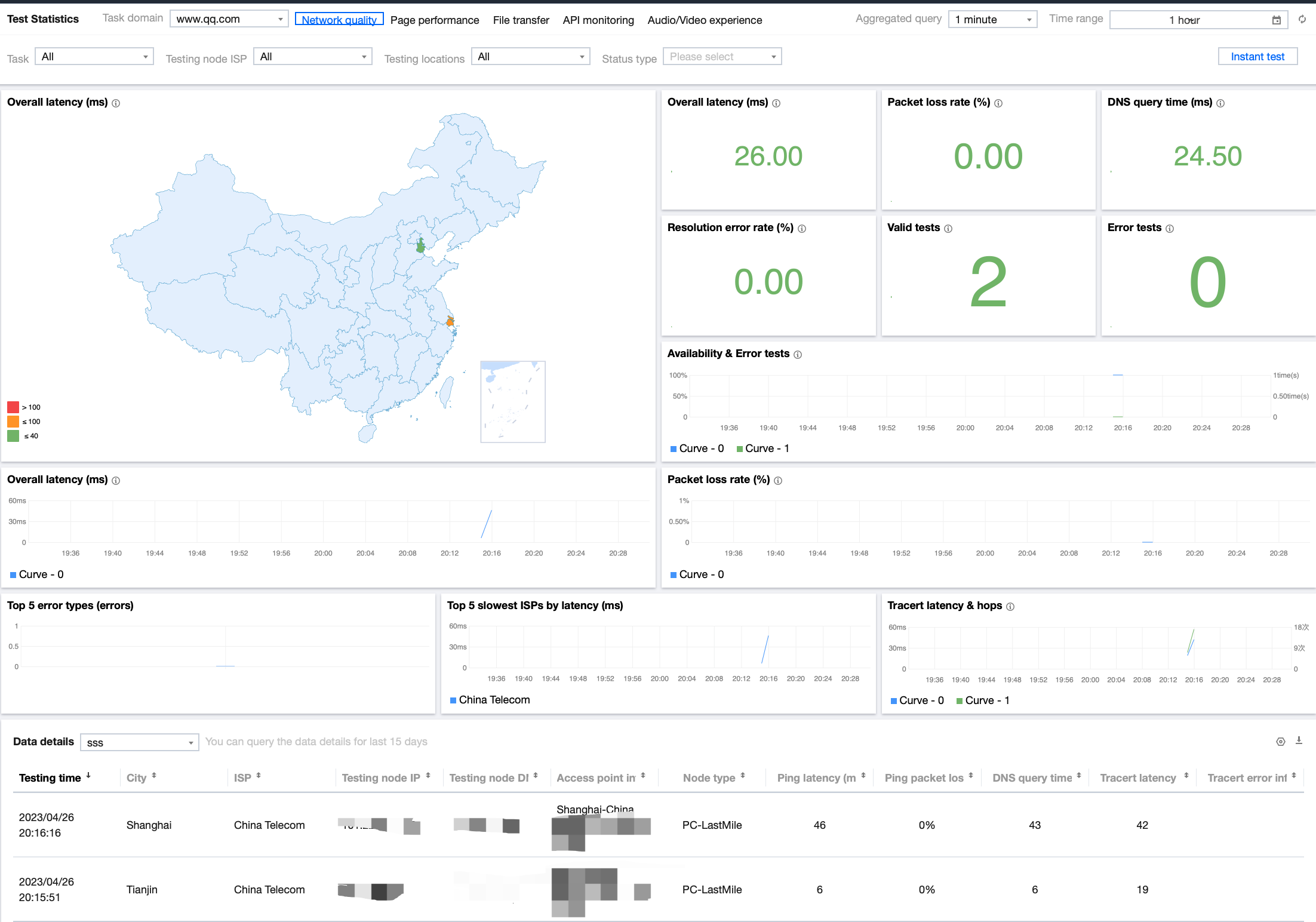 可用性(%) | 可用性为执行拨测任务的客户端对目标访问的成功率,可用性 = 有效拨测次数 / 总拨测次数 × 100%。 |