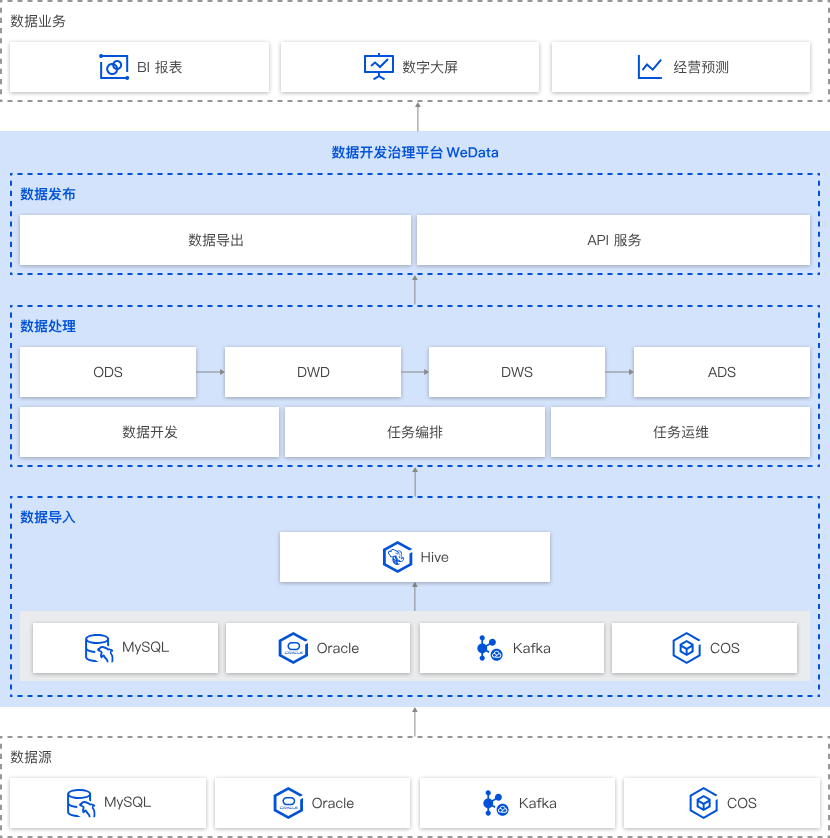 腾讯云数据开发治理平台 WeData 提供完善的数据处理功能,覆盖数据仓库构建全链路。从异构数据源数据导入,到通过丰富的大数据组件支持对数据开发、任务编排、任务运维等全过程的支持,对数仓各层次各数据域进行规范化生产,确保数据规范性、完整性、及时性等,最后通过数据导出或 API 服务的方式,将数据仓库生产的规范数据应用于企业各类型的数据业务,助力企业用数据赋能经营。