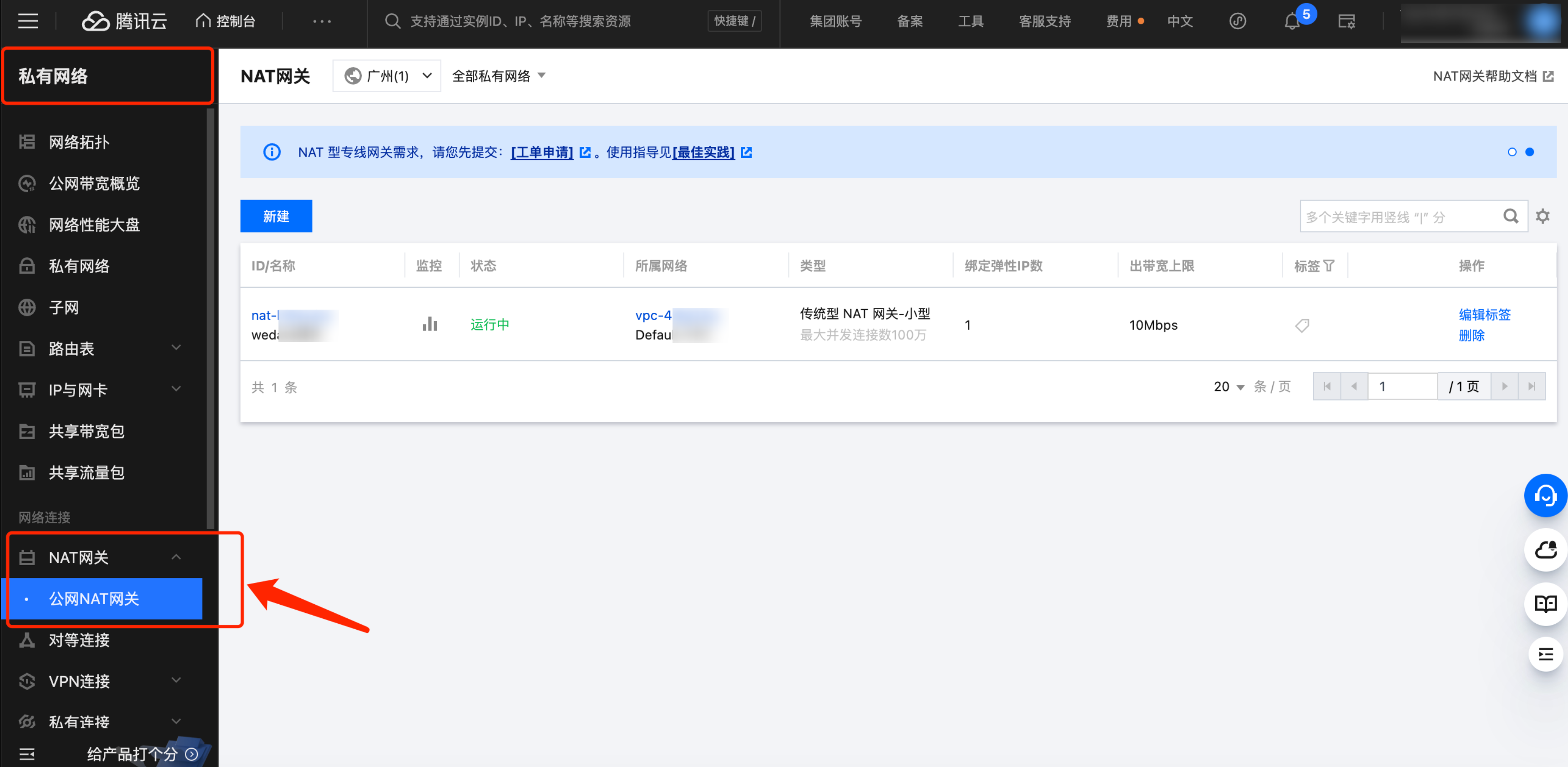 1. 进入腾讯云私有网络 > NAT 网关。在对应地域单击新建 NAT 网关。