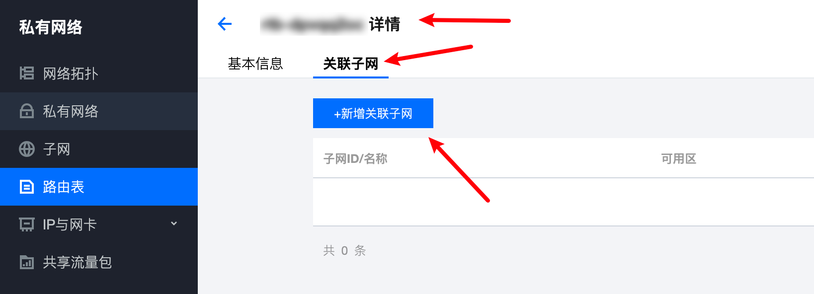 5. 路由表创建完成后进入路由表详情,关联绑定子网: