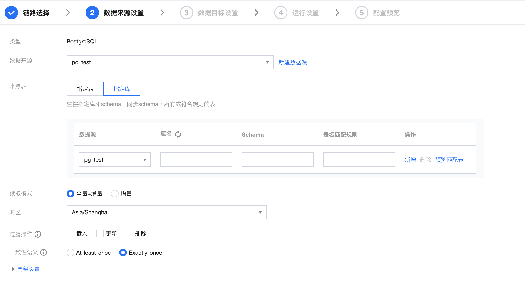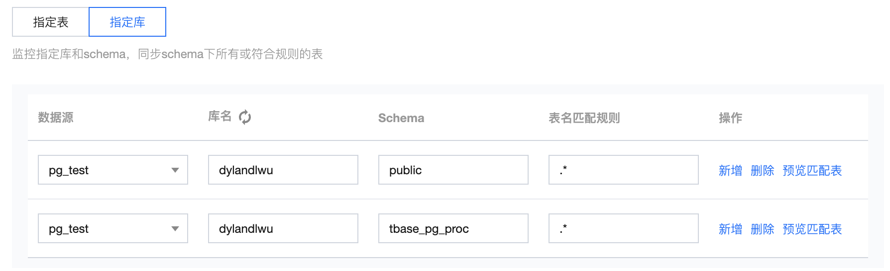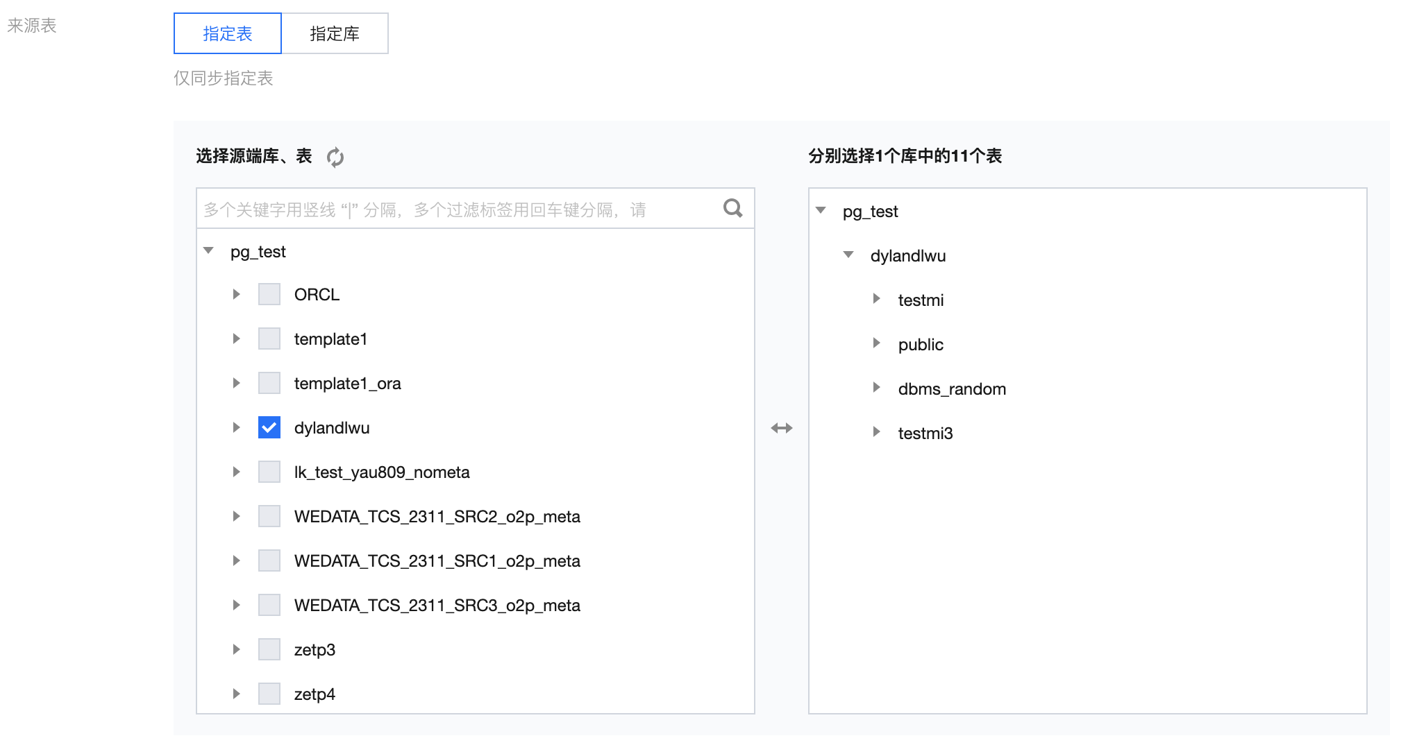 来源表 | PostgreSQL 只支持指定表和指定库,不支持所有所有库表: 指定表:此选项下需指定到具体表名称,设置后任务仅同步指定表,只能选择一个库下的表,不支持跨库选择;若需要新增同步表需暂停并重启任务。 ![]() 指定库:此选项下需指定具体库名、表名正则表达式。其中库名必须要相同,不支持多个数据库。设置后,任务运行期间符合表名表达式的新增表默认将同步至目标端。 ![]() |