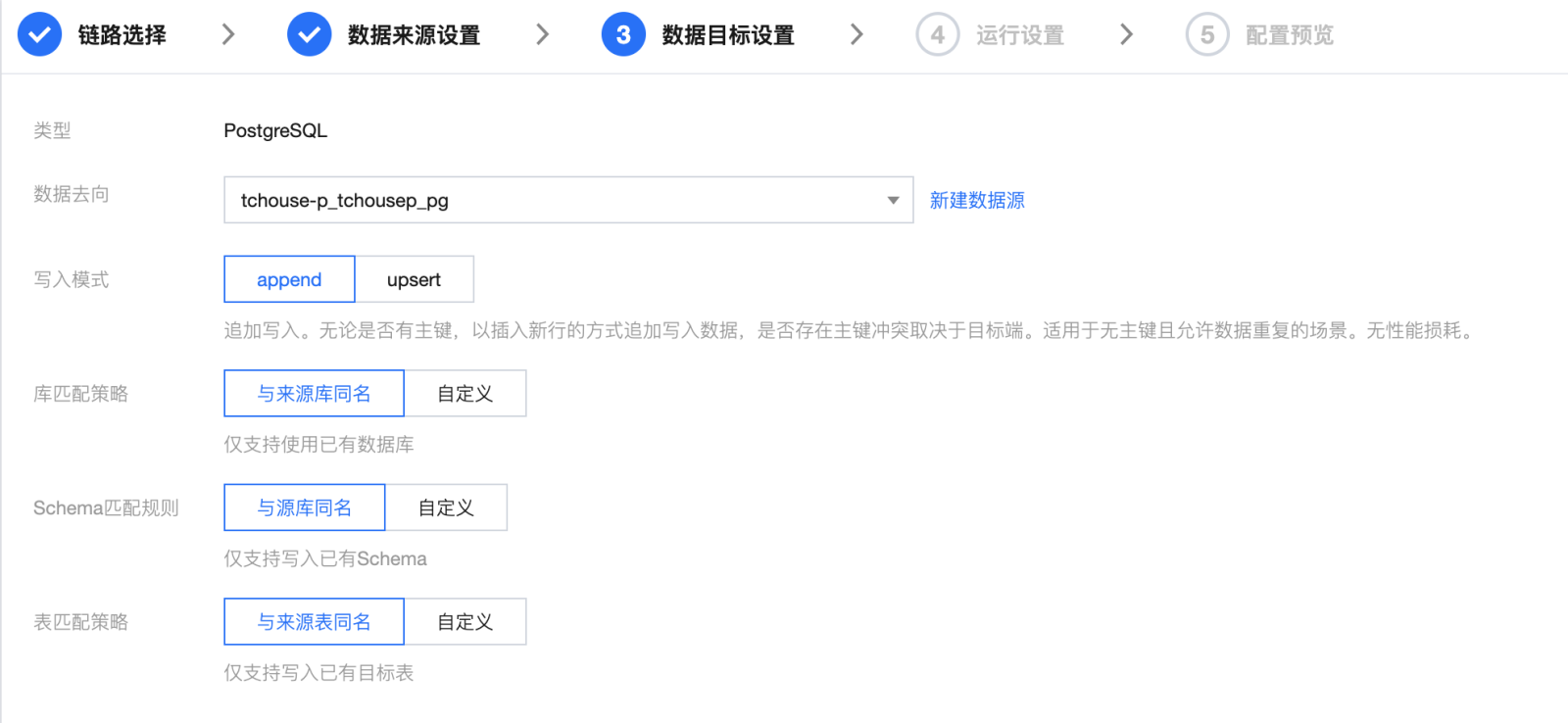 写入模式 | Upsert:更新方式写入目标表。此方式下要求目标表中已设置主键。任务将默认使用主键作为唯一键进行记录更新。 若表无主键则 Append 写入。 Append:追加模式写入数据表。 |