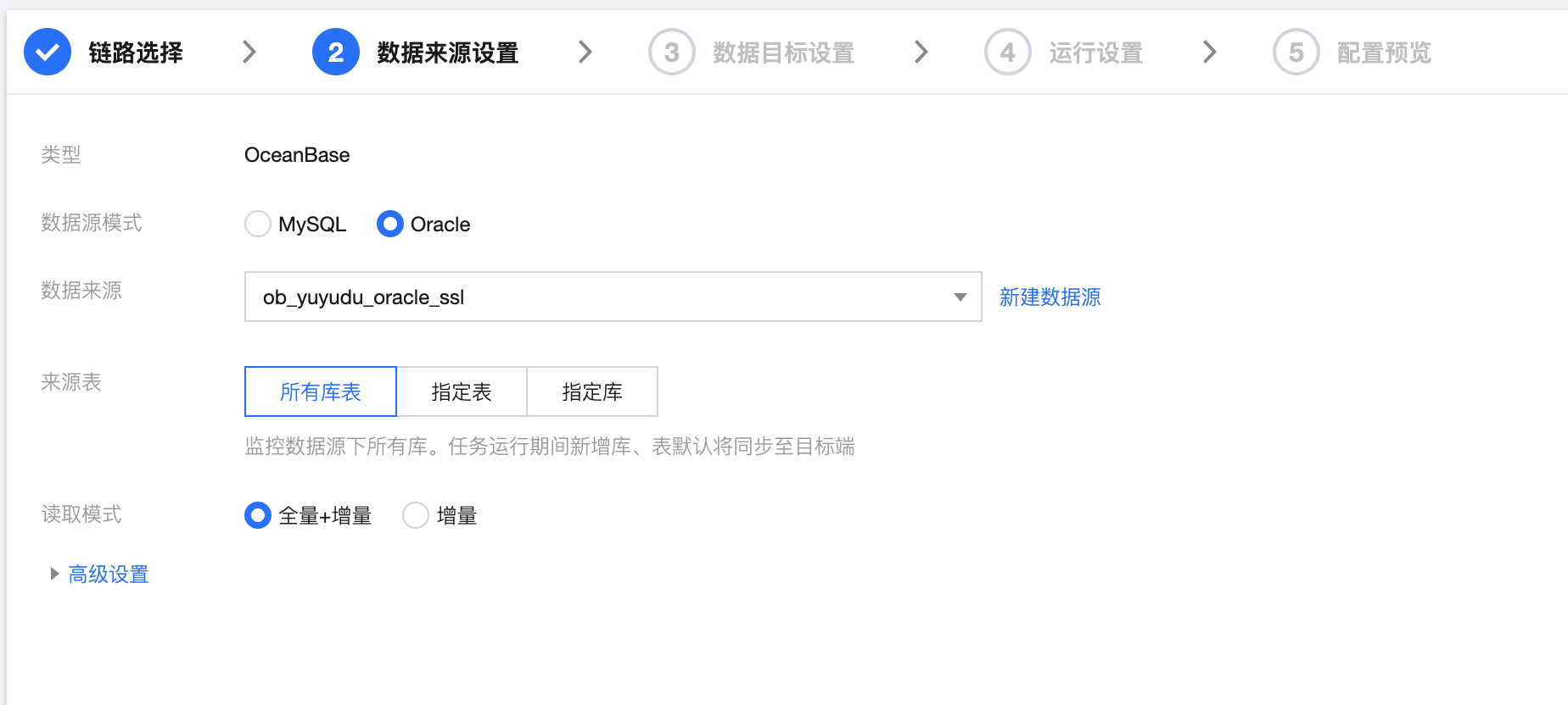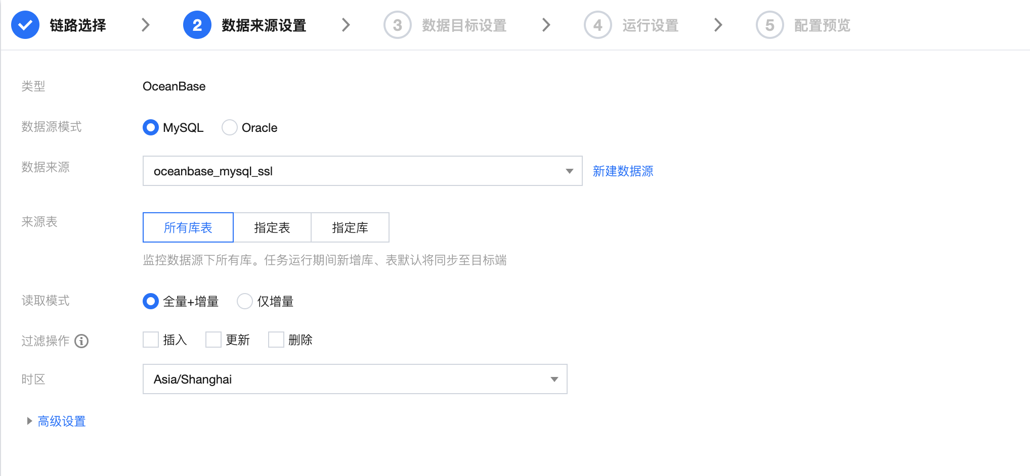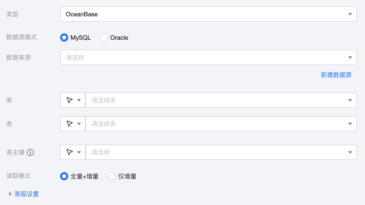 数据来源 | 选择需要同步的 OceanBase 数据源。此处会根据选择的数据源模式进行过滤,如选择 MySQL 模式,此处只展示 MySQL模式的 OceanBase 数据源,不展示 Oracle 模式的数据源。 |