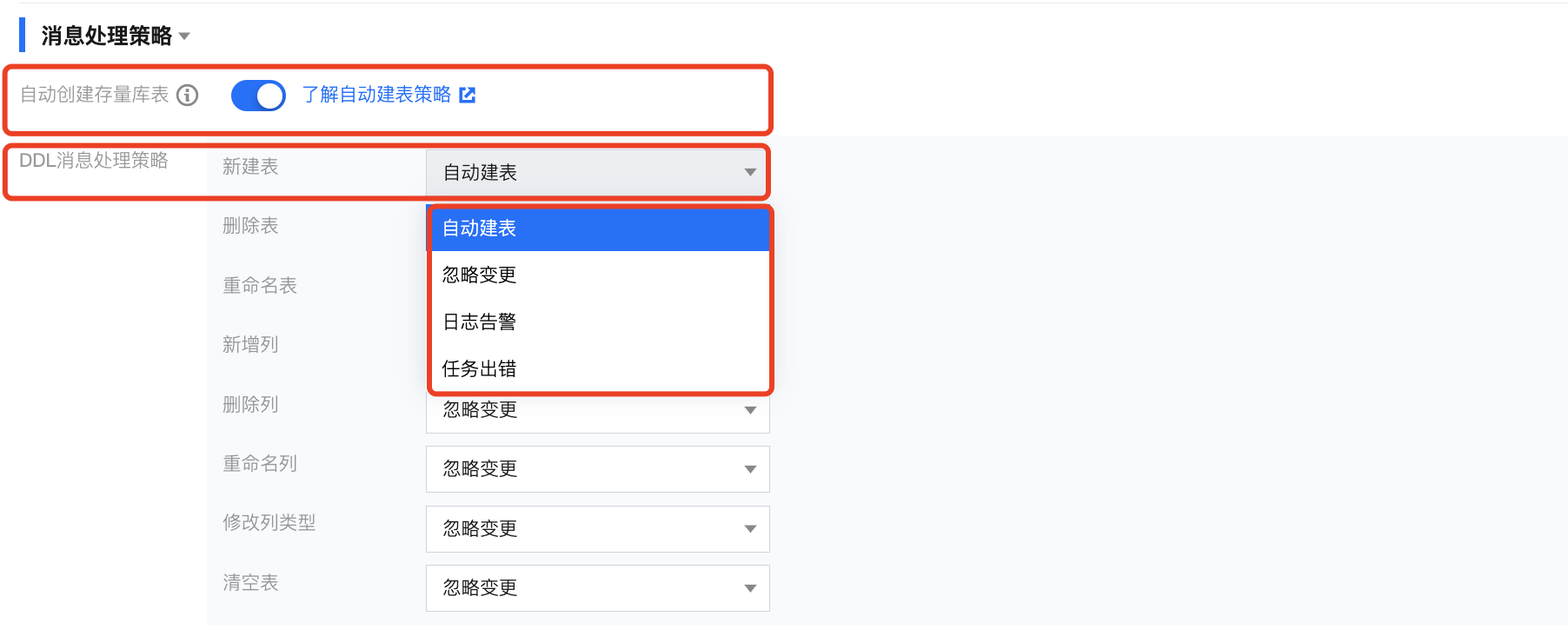 根据源端 DDL 消息自动建表 | ![]() | 此功能可实时监控来源端是否存在新建表 DDL,一旦源端产生可识别新建表消息,目标端可自动根据来源表结构自动生成目标端表对象。 功能关键词:DDL 自动感知与响应、自动建表。 | 本功能适合在实时整库搬迁时,期望目标端与来源端实时保证结构一致的数据同步场景。 |