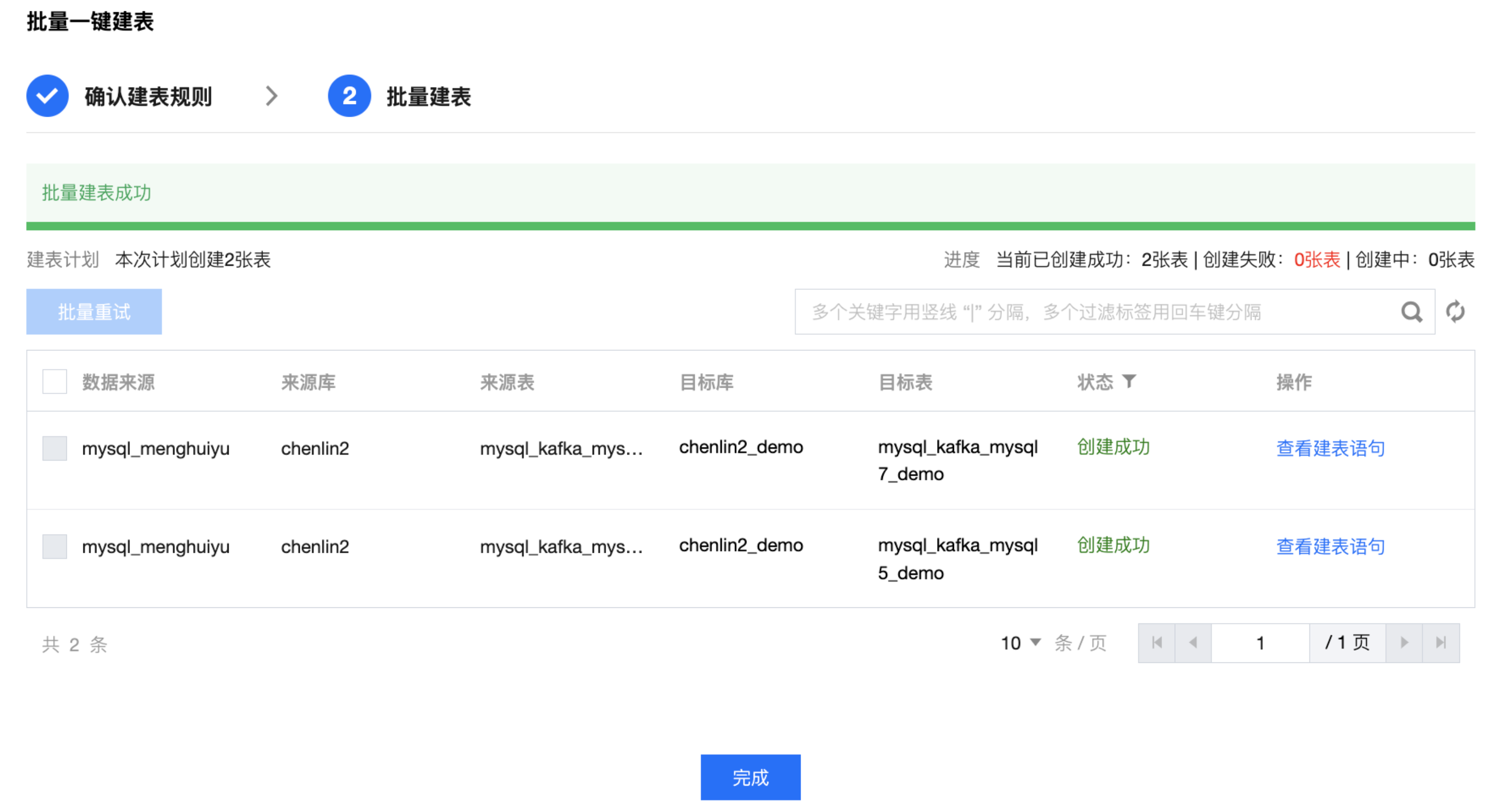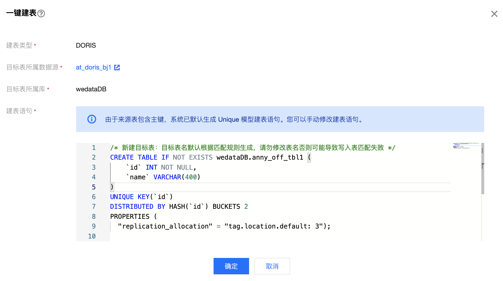 一键建表 | ![]() | 此功能可根据来源端指定的多个表对象自动完成来源至目标端的 DDL 转换,支持用户手动修改转换后的 DDL 内容,并一次性批量创建。