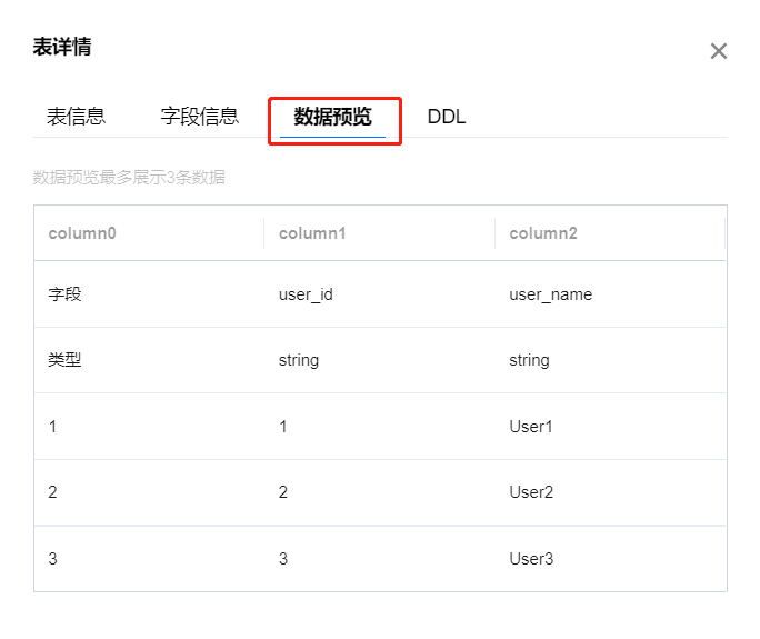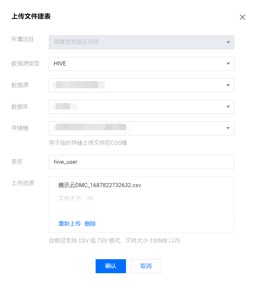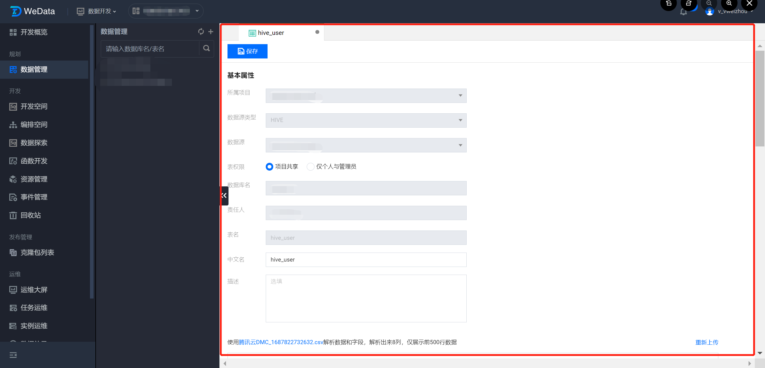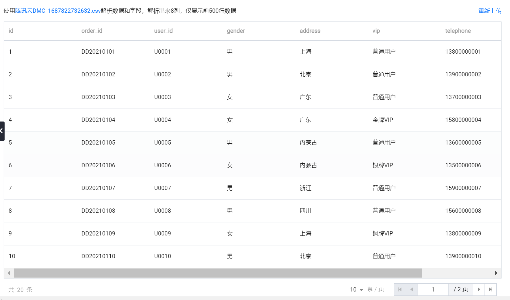 文件属性 | 数据预览 | 文件解析后仅展示前500行数据,单击重新上传会弹出文件上传弹框用于重新上传建表文件。 ![]() |